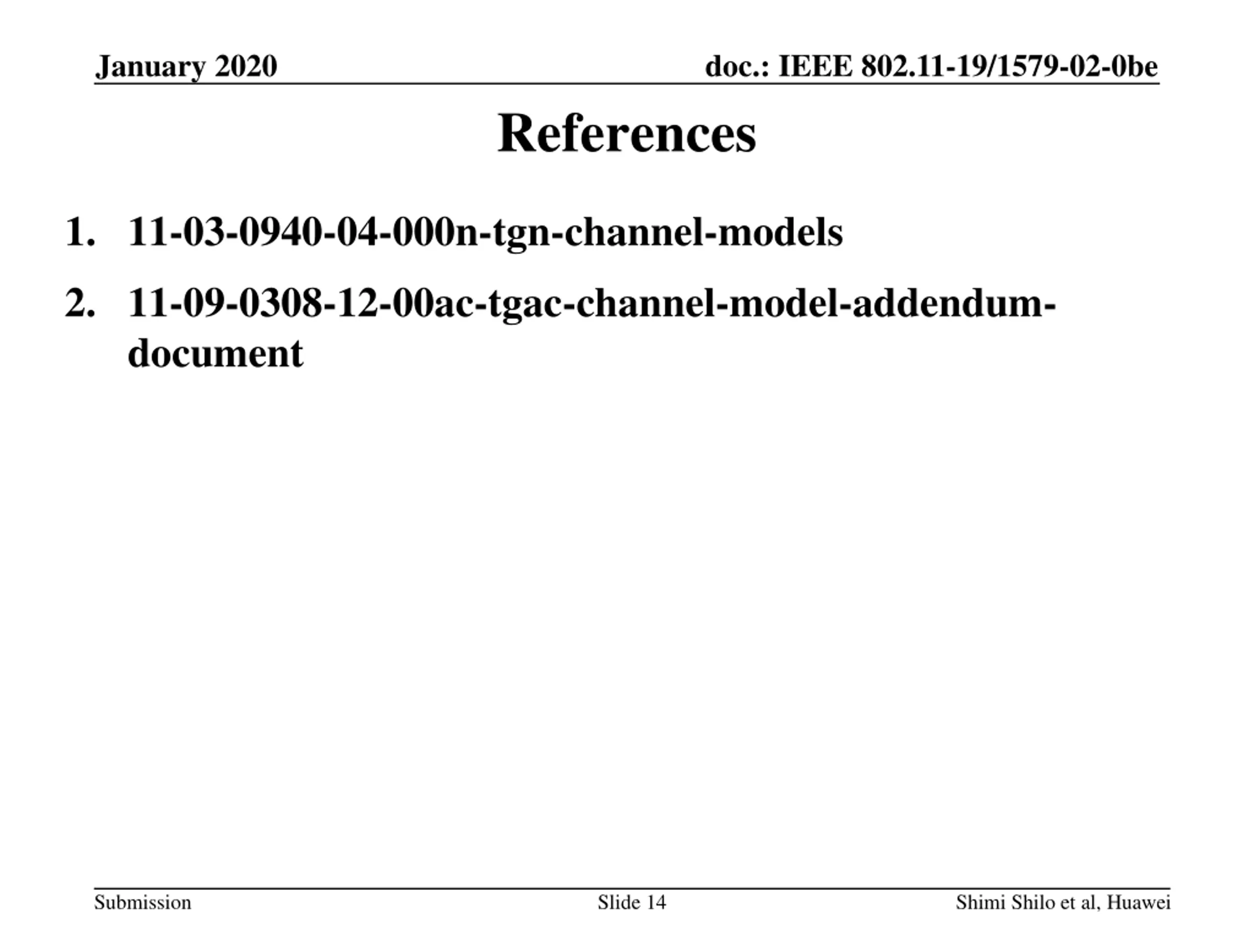 January 2020 doc.: IEEE 802.11-19/1579-02-0be References 1. 11-03-0940-04-000n-tgn-channel-models 2. 11-09-0308-12-00ac-tgac-channel-model-addendum- document Submission Slide 14 Shimi Shilo et al, Huawei