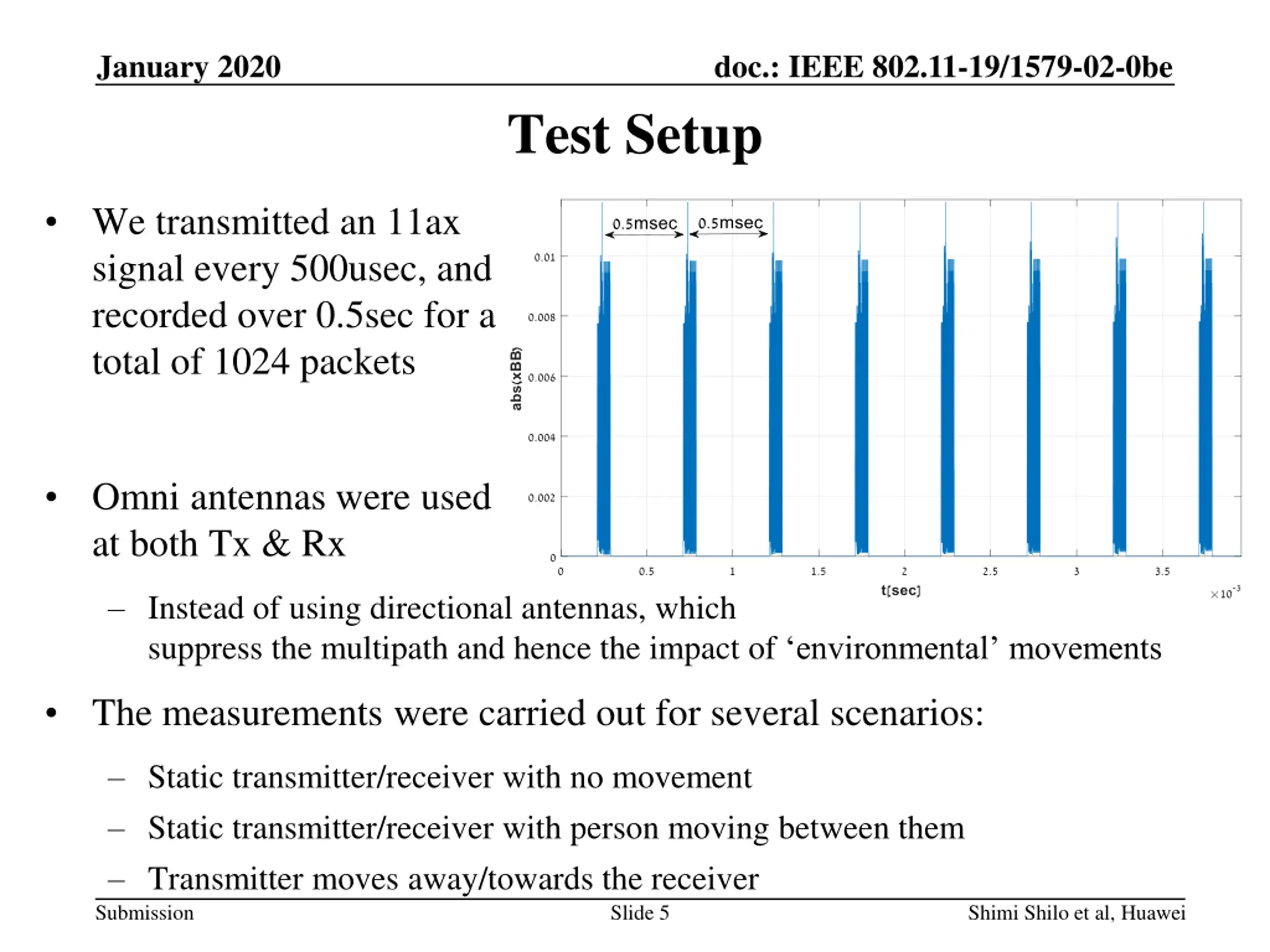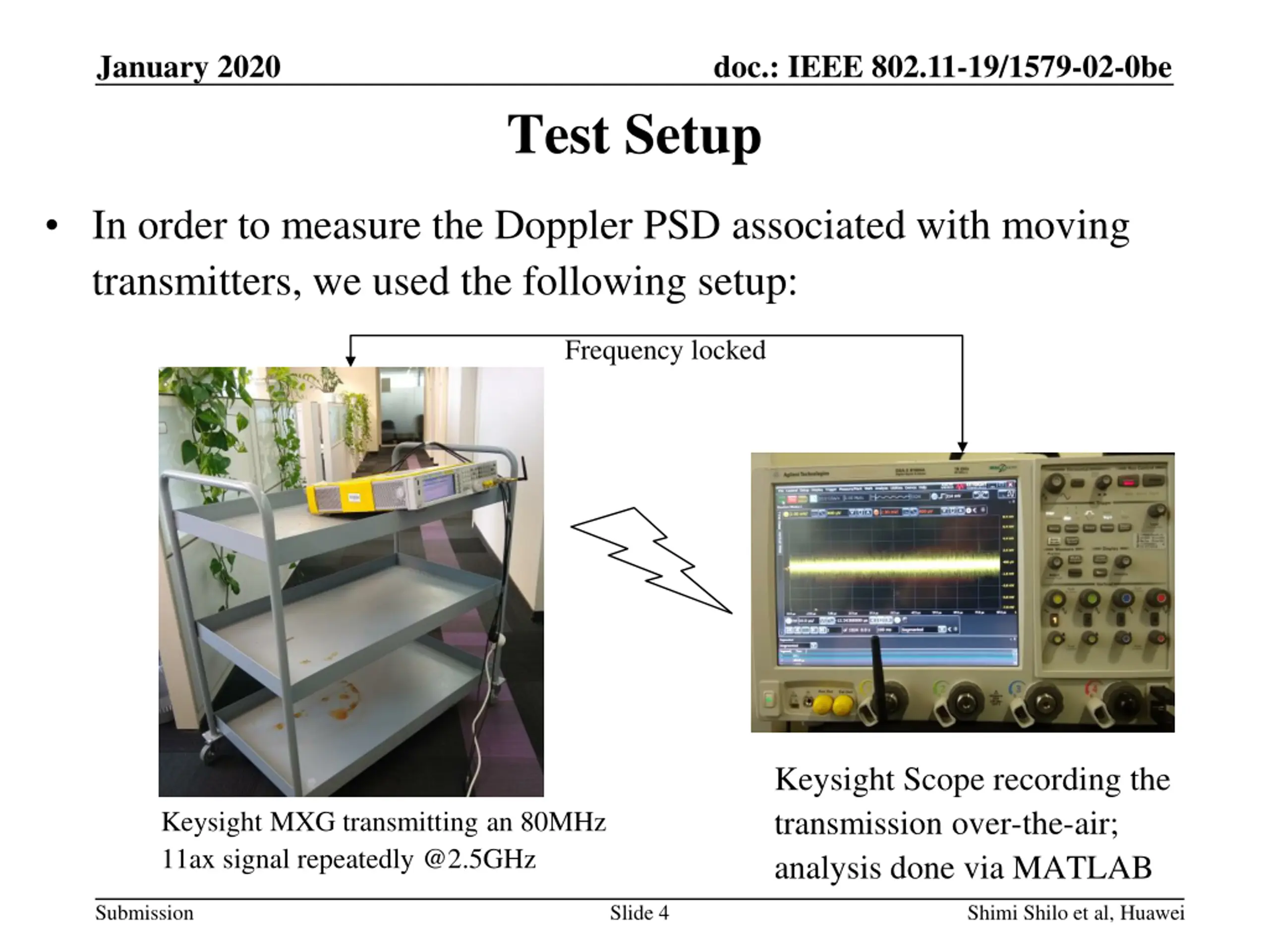 January 2020 doc.: IEEE 802.11-19/1579-02-0be Test Setup In order to measure the Doppler PSD associated with moving transmitters, we used the following setup: Frequency locked Keysight Scope recording the transmission over-the-air; analysis done via MATLAB Keysight MXG transmitting an 80MHz 11ax signal repeatedly @2.5GHz Submission Slide 4 Shimi Shilo et al, Huawei