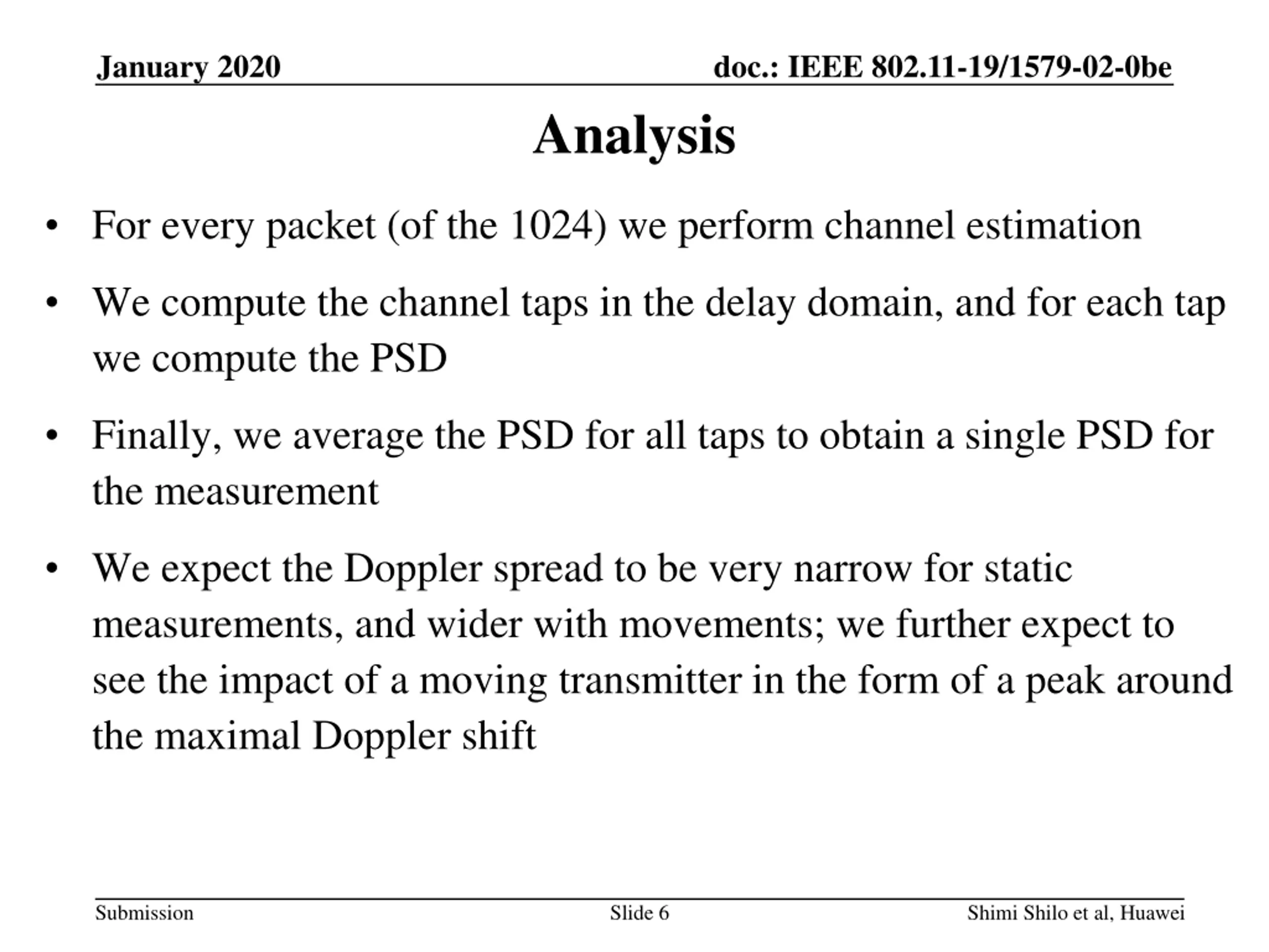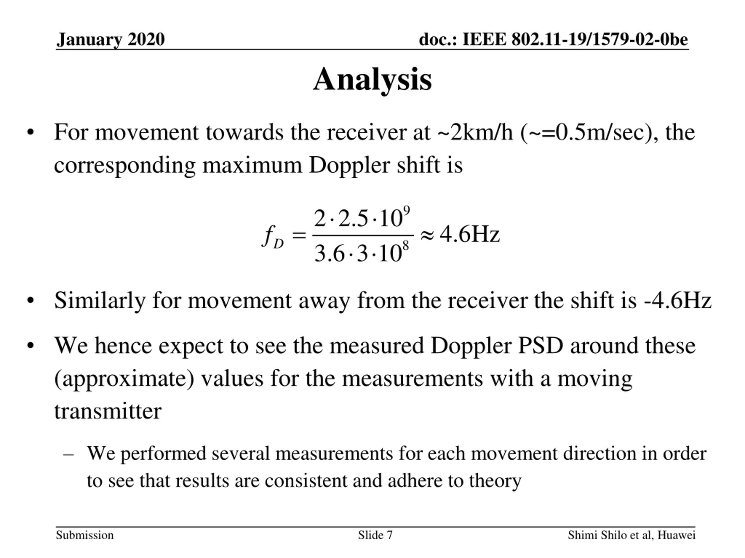 January 2020 doc.: IEEE 802.11-19/1579-02-0be Analysis For every packet (of the 1024) we perform channel estimation We compute the channel taps in the delay domain, and for each tap we compute the PSD Finally, we average the PSD for all taps to obtain a single PSD for the measurement We expect the Doppler spread to be very narrow for static measurements, and wider with movements; we further expect to see the impact of a moving transmitter in the form of a peak around the maximal Doppler shift Submission Slide 6 Shimi Shilo et al, Huawei