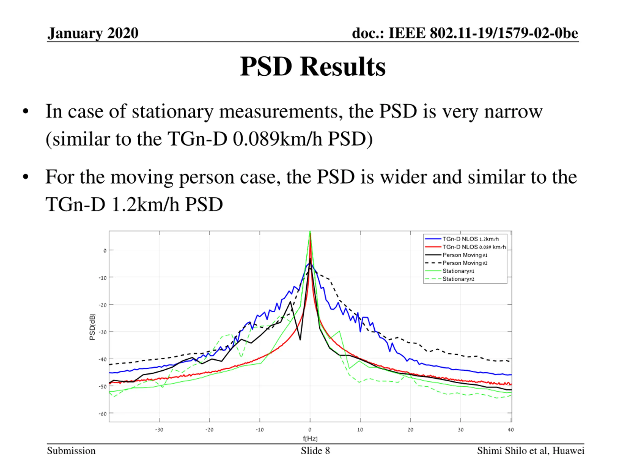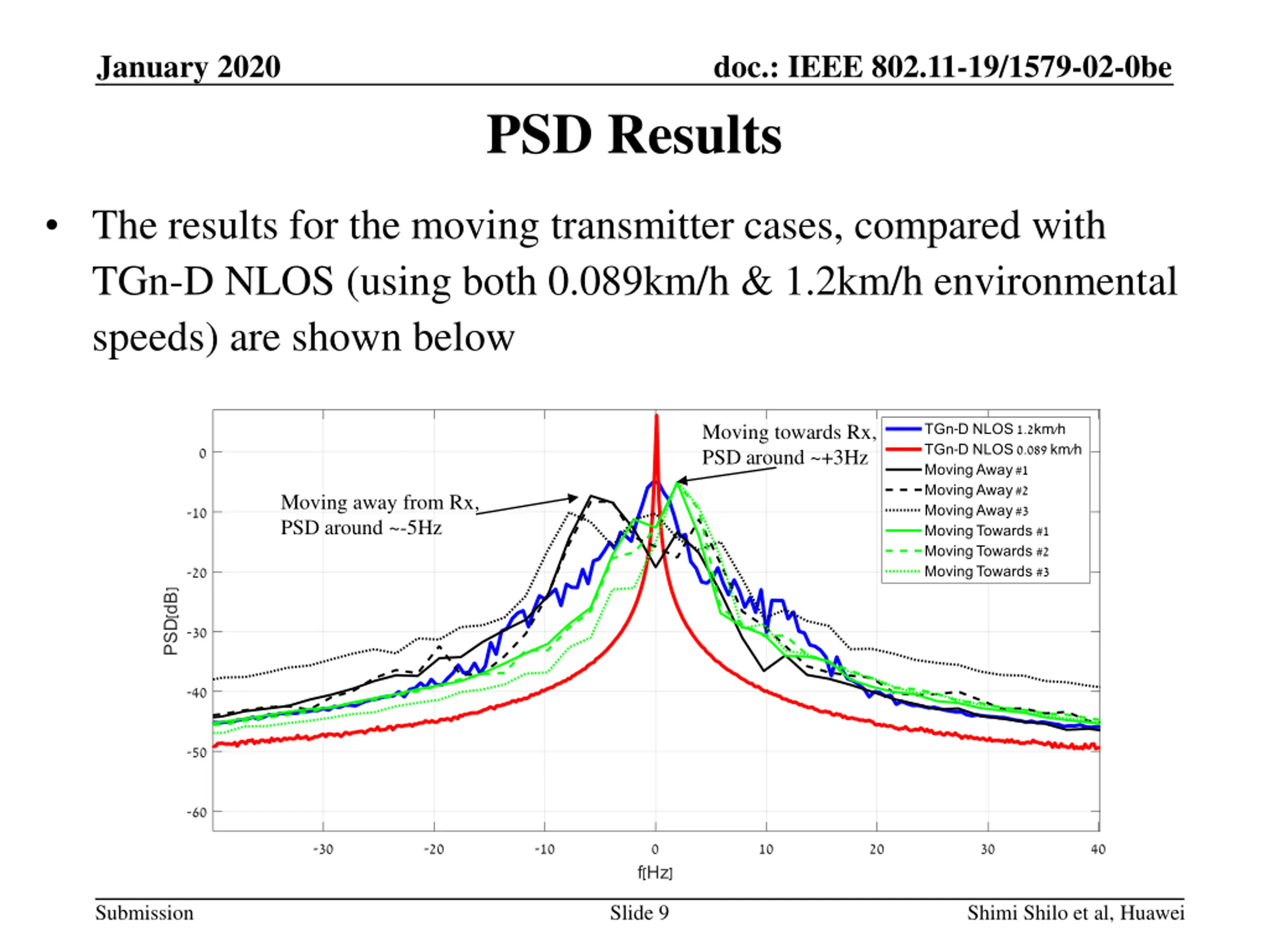January 2020 doc.: IEEE 802.11-19/1579-02-0be PSD Results In case of stationary measurements, the PSD is very narrow (similar to the TGn-D 0.089km/h PSD) For the moving person case, the PSD is wider and similar to the TGn-D 1.2km/h PSD Submission Slide 8 Shimi Shilo et al, Huawei