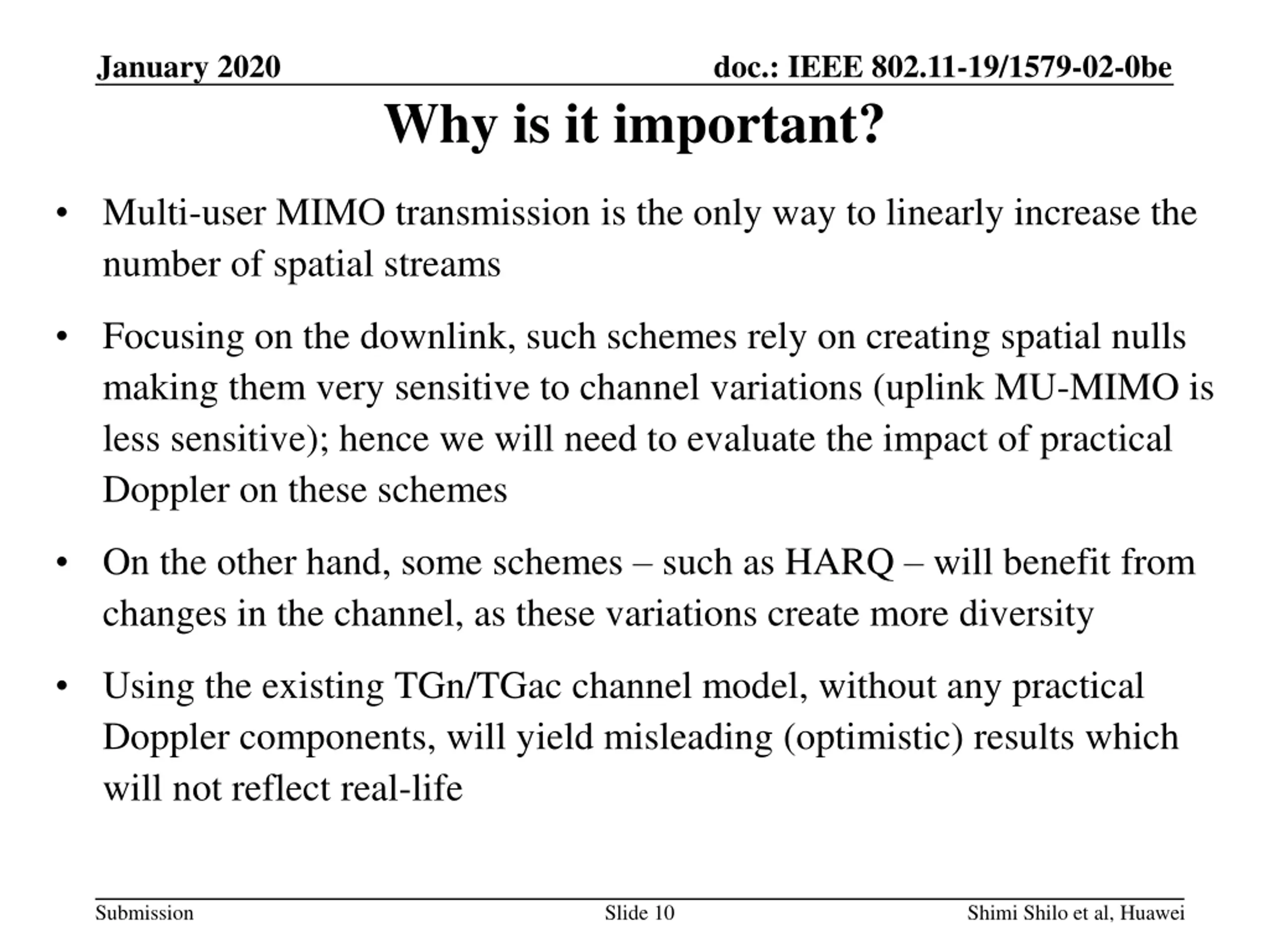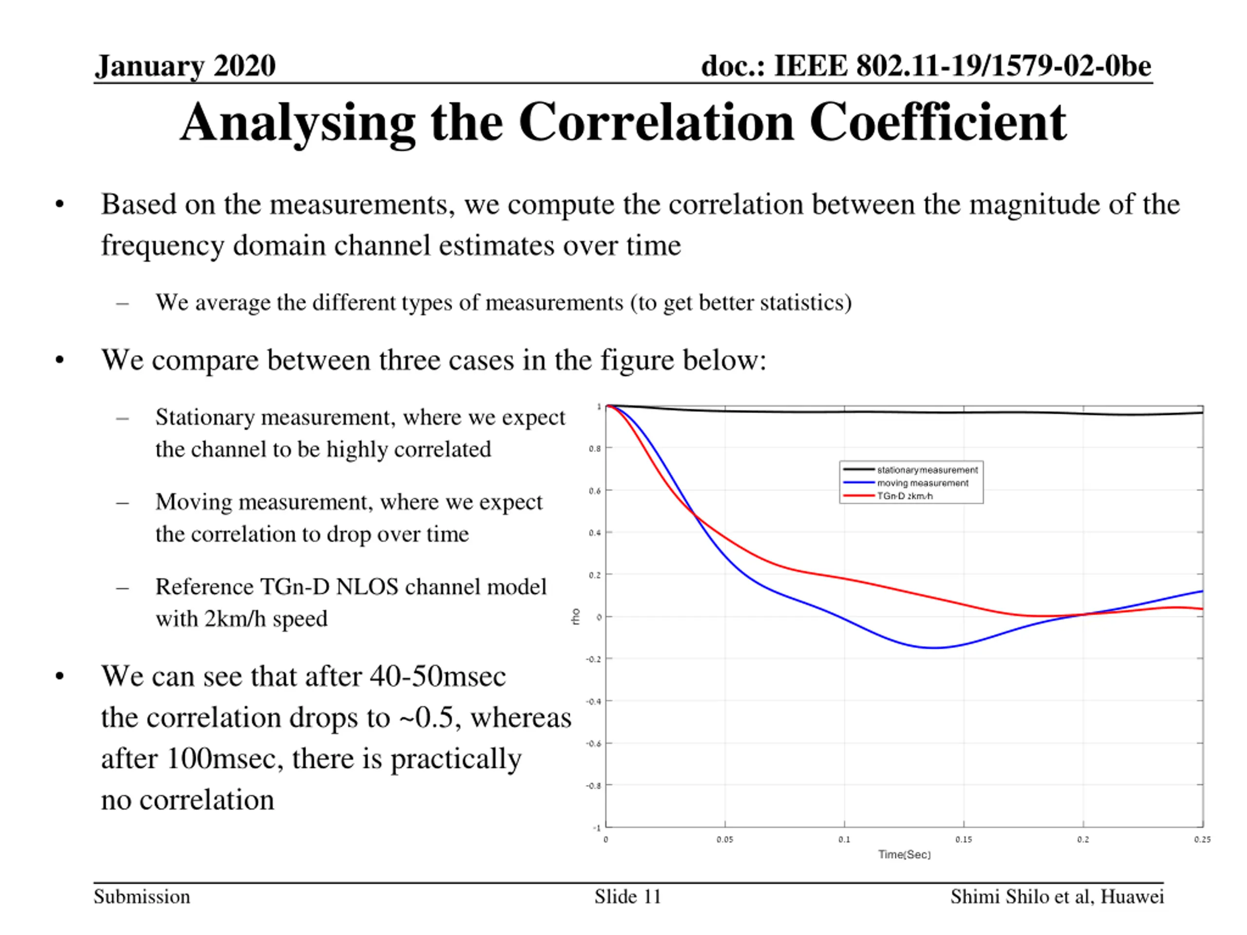 January 2020 doc.: IEEE 802.11-19/1579-02-0be Why is it important? Multi-user MIMO transmission is the only way to linearly increase the number of spatial streams Focusing on the downlink, such schemes rely on creating spatial nulls making them very sensitive to channel variations (uplink MU-MIMO is less sensitive); hence we will need to evaluate the impact of practical Doppler on these schemes On the other hand, some schemes such as HARQ will benefit from changes in the channel, as these variations create more diversity Using the existing TGn/TGac channel model, without any practical Doppler components, will yield misleading (optimistic) results which will not reflect real-life Submission Slide 10 Shimi Shilo et al, Huawei