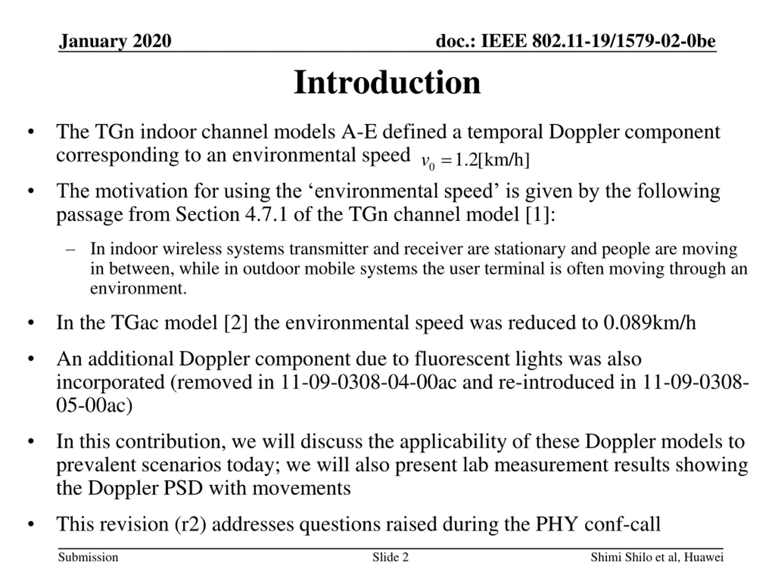 January 2020 doc.: IEEE 802.11-19/1579-02-0be Introduction The TGn indoor channel models A-E defined a temporal Doppler component corresponding to an environmental speed v = 1.2[km/h] 0 The motivation for using the environmental speed is given by the following passage from Section 4.7.1 of the TGn channel model [1]: In indoor wireless systems transmitter and receiver are stationary and people are moving in between, while in outdoor mobile systems the user terminal is often moving through an environment. In the TGac model [2] the environmental speed was reduced to 0.089km/h An additional Doppler component due to fluorescent lights was also incorporated (removed in 11-09-0308-04-00ac and re-introduced in 11-09-0308- 05-00ac) In this contribution, we will discuss the applicability of these Doppler models to prevalent scenarios today; we will also present lab measurement results showing the Doppler PSD with movements This revision (r2) addresses questions raised during the PHY conf-call Submission Slide 2 Shimi Shilo et al, Huawei