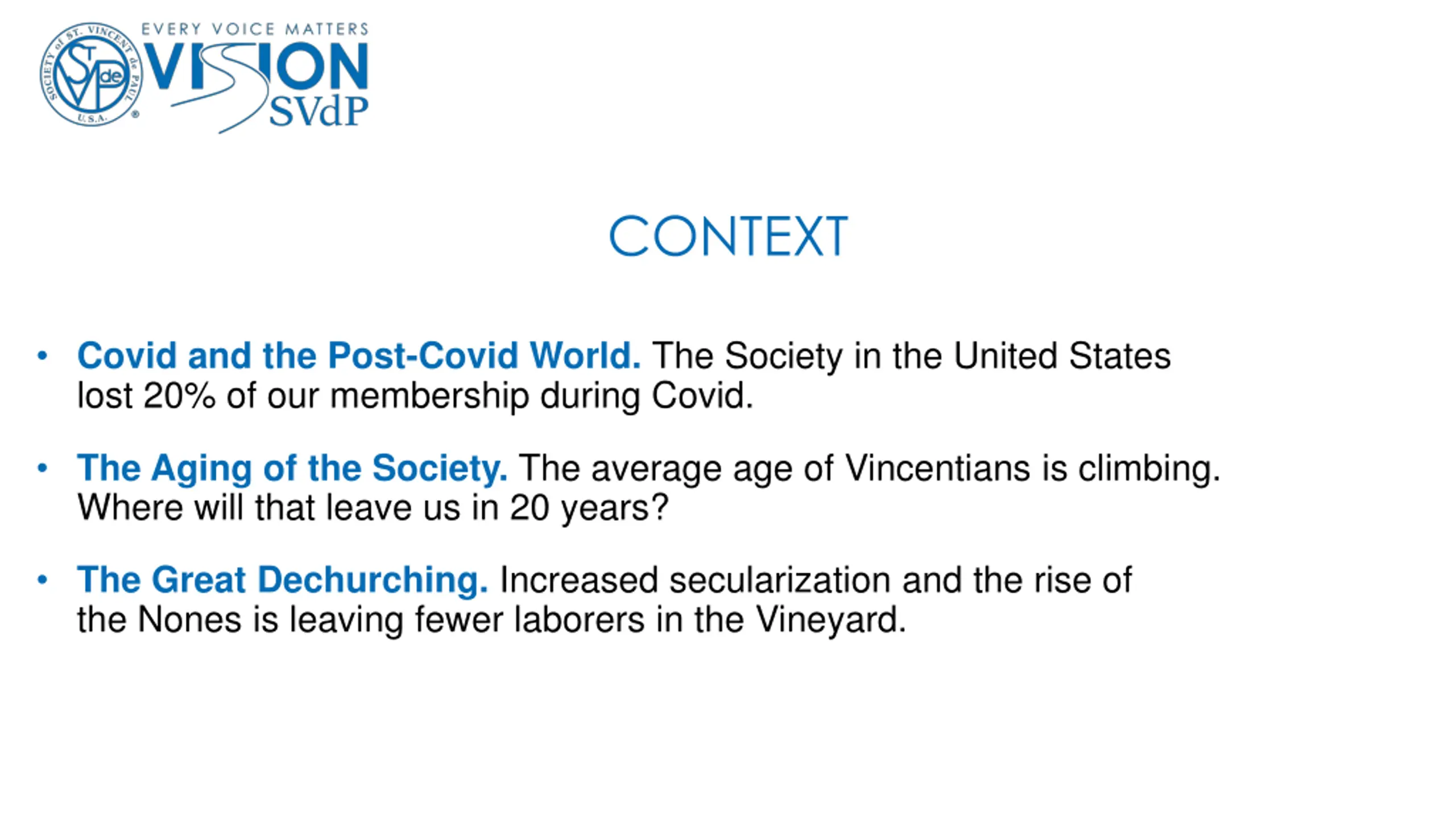 CONTEXT Covid and the Post-Covid World. The Society in the United States lost 20% of our membership during Covid. The Aging of the Society. The average age of Vincentians is climbing. Where will that leave us in 20 years? The Great Dechurching. Increased secularization and the rise of the Nones is leaving fewer laborers in the Vineyard.