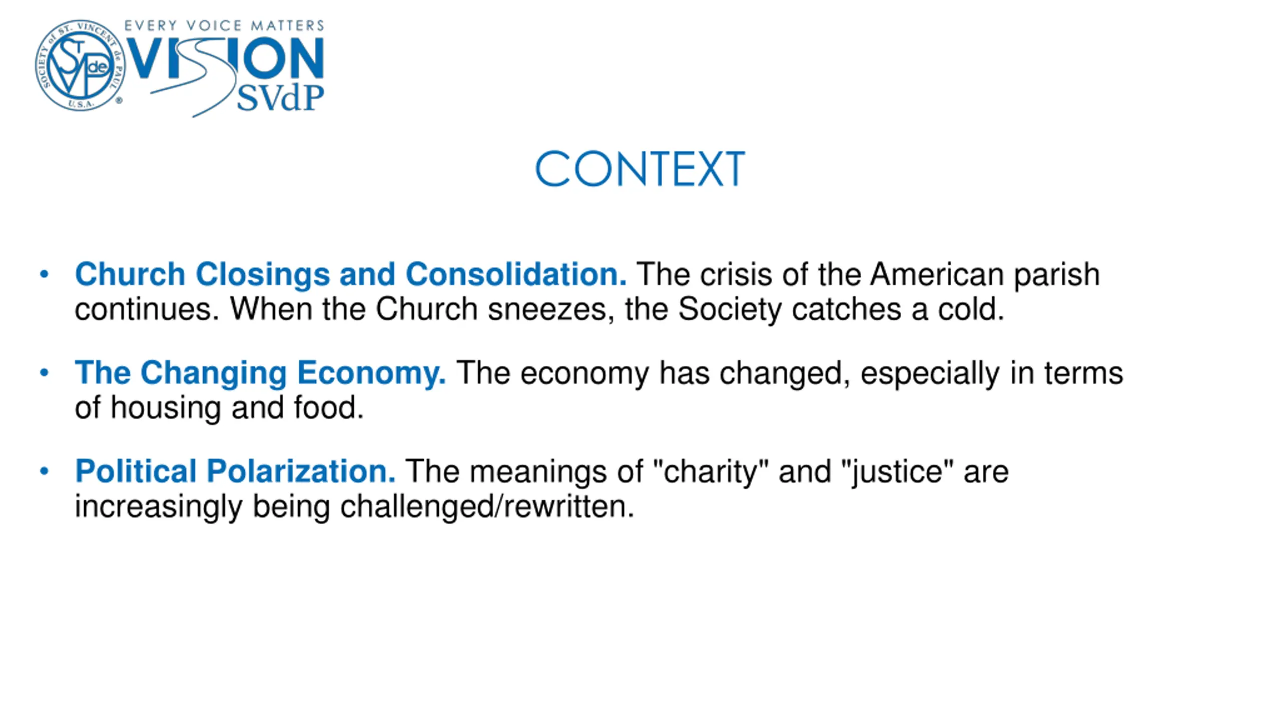 CONTEXT Church Closings and Consolidation. The crisis of the American parish continues. When the Church sneezes, the Society catches a cold. The Changing Economy. The economy has changed, especially in terms of housing and food. Political Polarization. The meanings of "charity" and "justice" are increasingly being challenged/rewritten.
