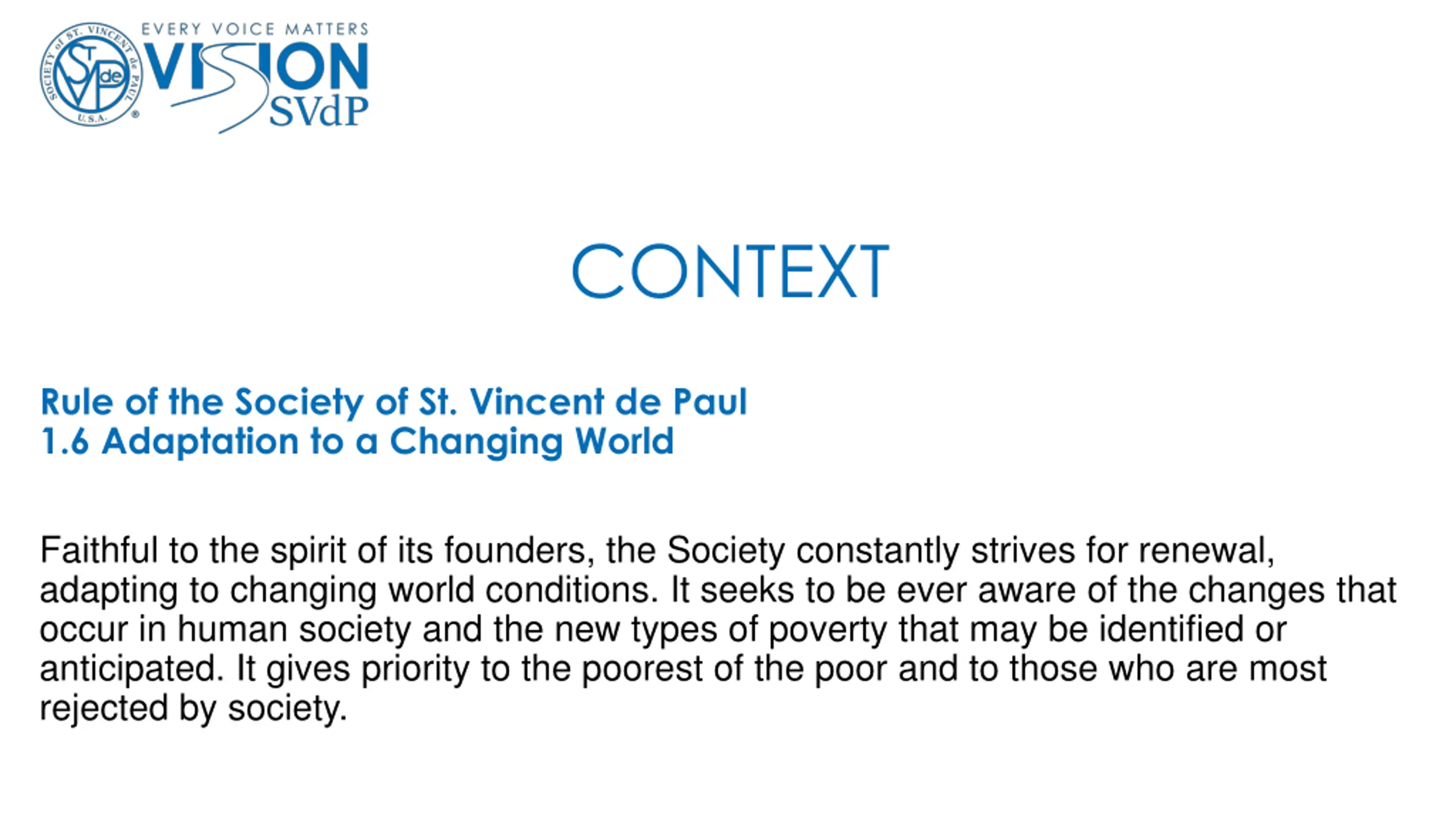 CONTEXT Rule of the Society of St. Vincent de Paul 1.6 Adaptation to a Changing World Faithful to the spirit of its founders, the Society constantly strives for renewal, adapting to changing world conditions. It seeks to be ever aware of the changes that occur in human society and the new types of poverty that may be identified or anticipated. It gives priority to the poorest of the poor and to those who are most rejected by society.