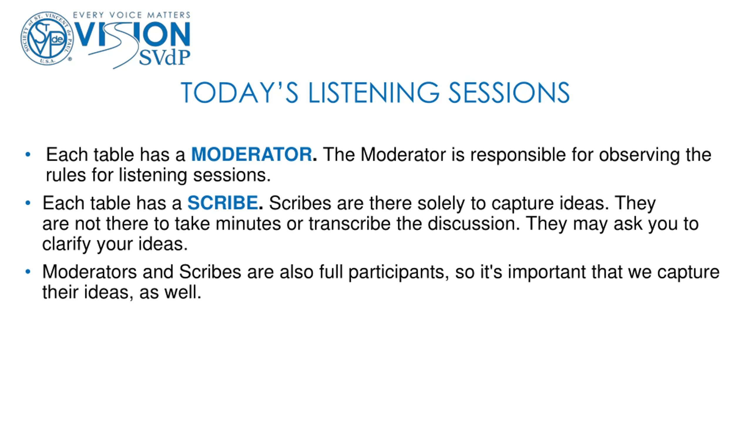 TODAYS LISTENING SESSIONS Each table has a MODERATOR. The Moderator is responsible for observing the rules for listening sessions. Each table has a SCRIBE. Scribes are there solely to capture ideas. They are not there to take minutes or transcribe the discussion. They may ask you to clarify your ideas. Moderators and Scribes are also full participants, so it's important that we capture their ideas, as well.