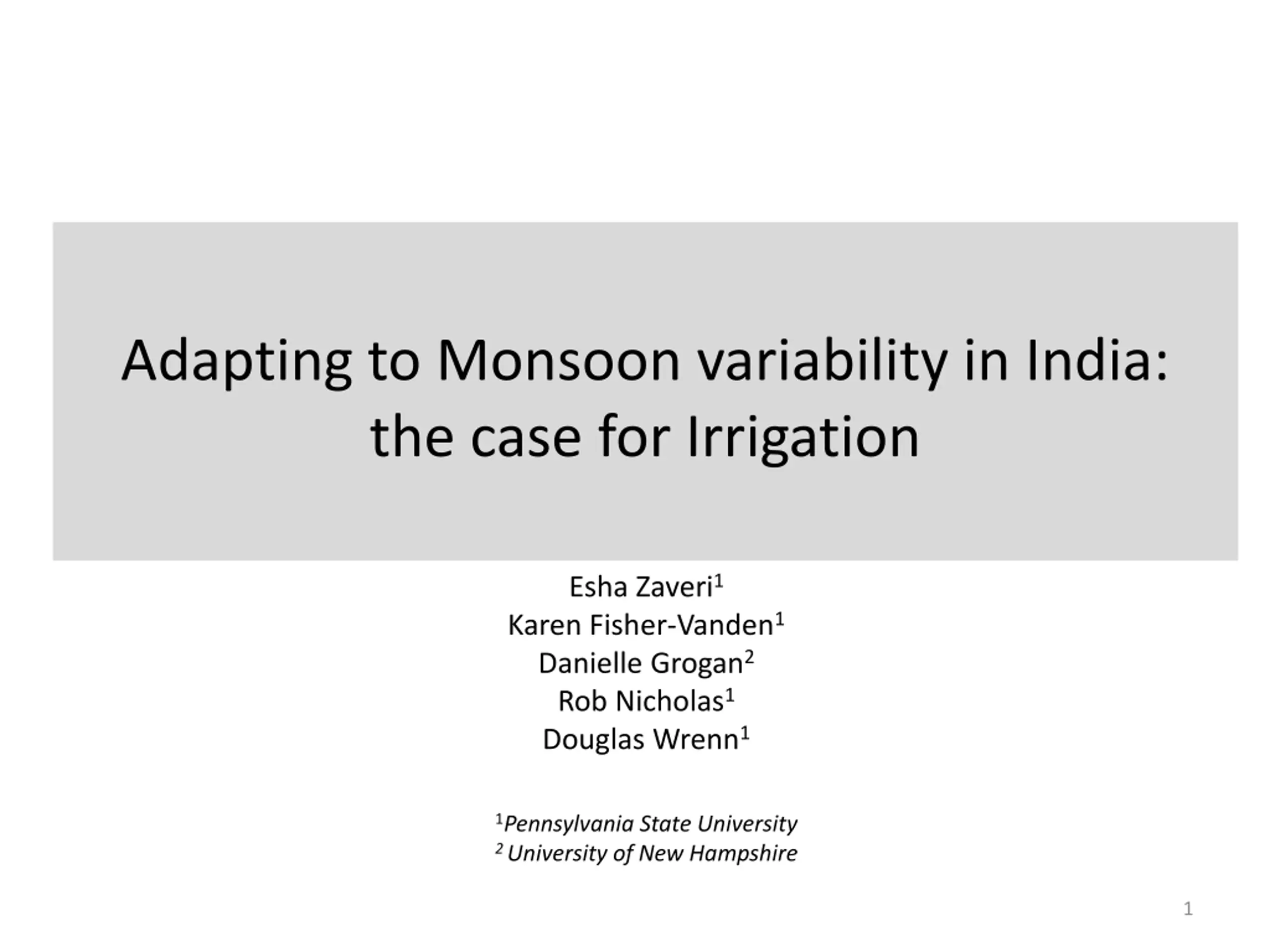 Adapting to Monsoon variability in India: the case for Irrigation Esha Zaveri1 Karen Fisher-Vanden1 Danielle Grogan2 Rob Nicholas1 Douglas Wrenn1 1Pennsylvania State University 2 University of New Hampshire 1