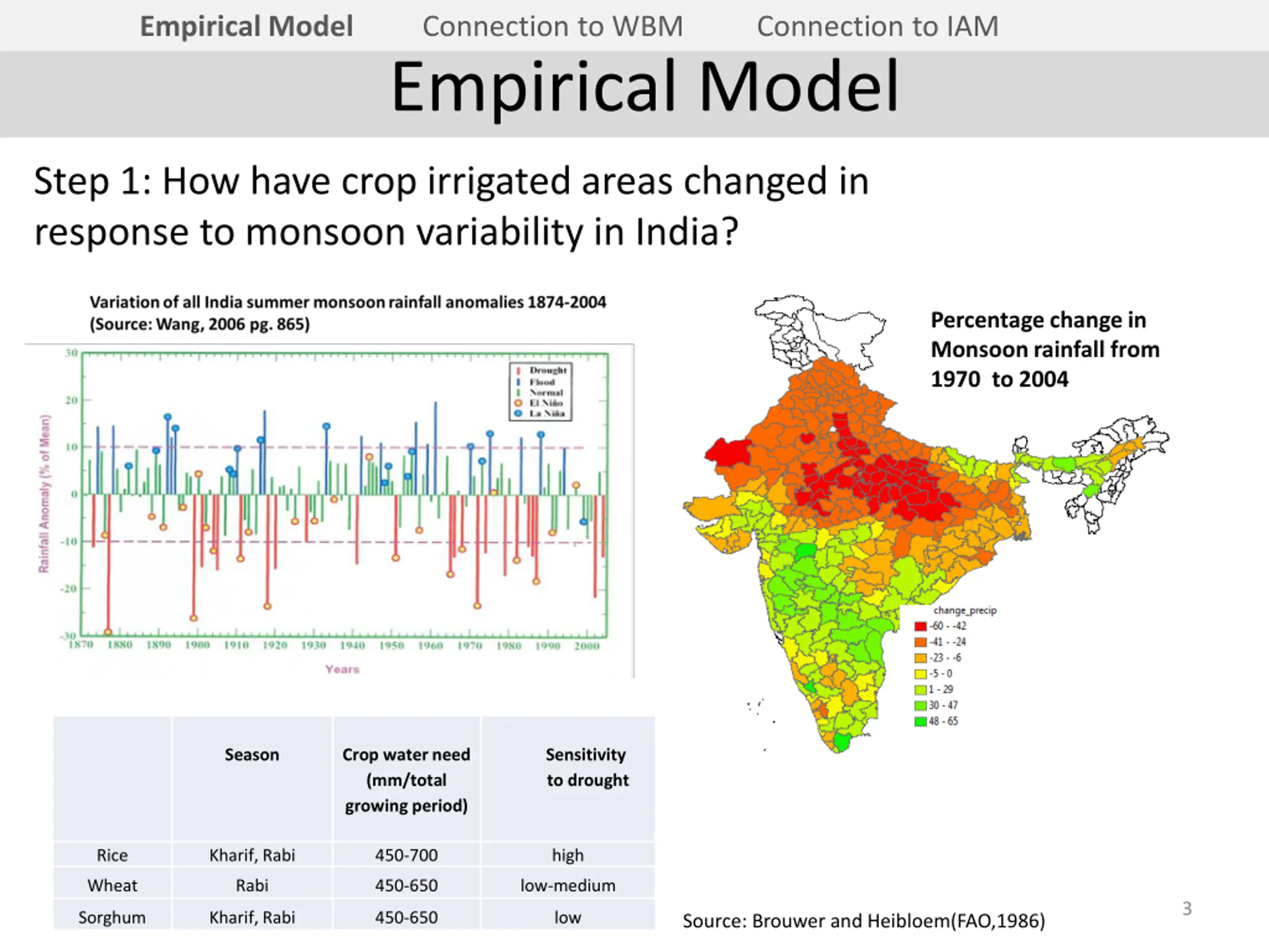 Empirical Model Connection to WBM Connection to IAM Empirical Model Step 1: How have crop irrigated areas changed in response to monsoon variability in India? Season Crop water need (mm/total growing period) Sensitivity to drought Rice Kharif, Rabi 450-700 high Wheat Rabi 450-650 low-medium 4 Source: Brouwer and Heibloem(FAO,1986) Sorghum Kharif, Rabi 450-650 low Source: Brouwer and Heibloem(FAO,1986)