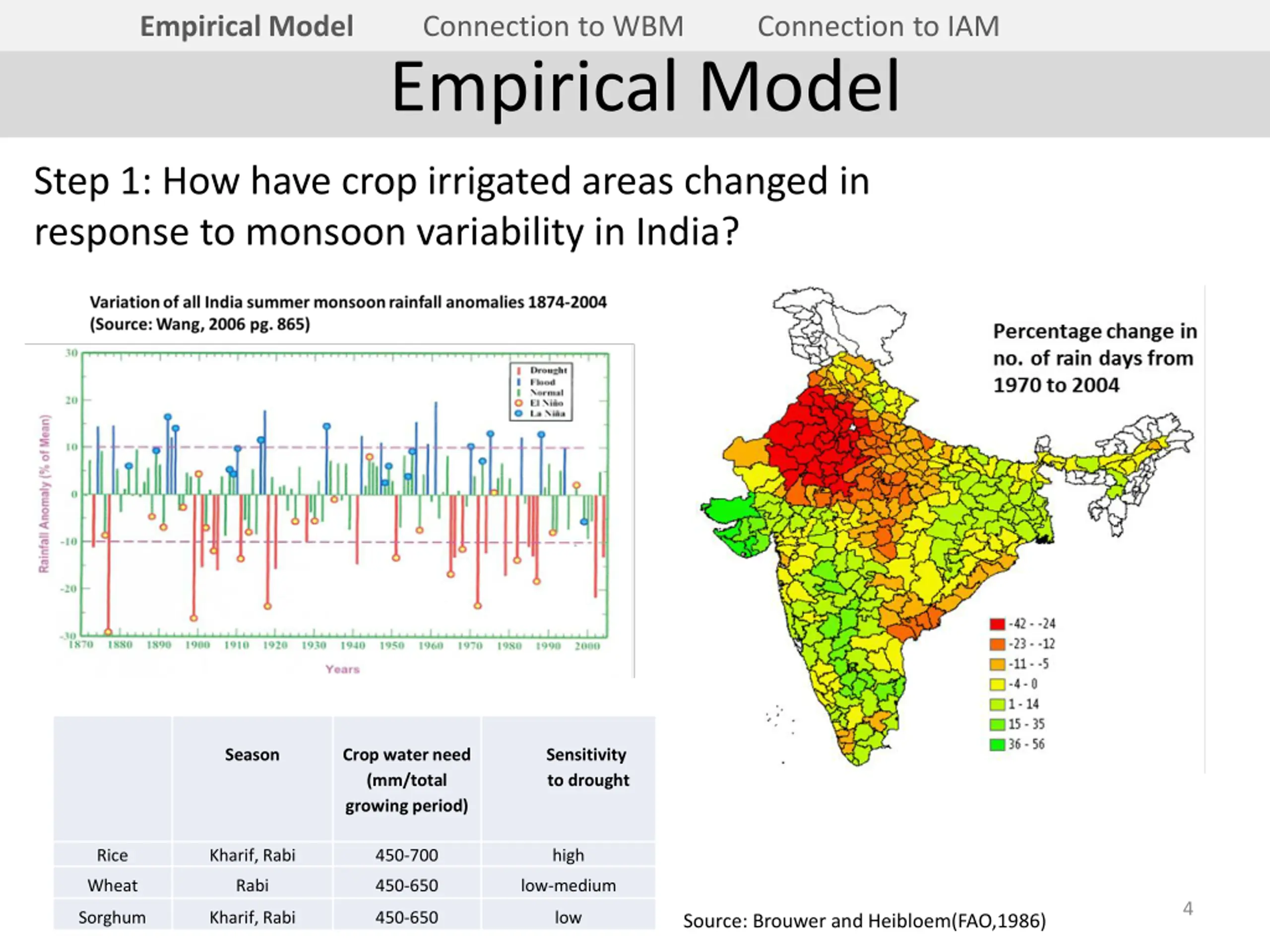 Empirical Model Connection to WBM Connection to IAM Empirical Model Step 1: How have crop irrigated areas changed in response to monsoon variability in India? Percentage change in Monsoon rainfall from 1970 to 2004 Season Crop water need (mm/total growing period) Sensitivity to drought Rice Kharif, Rabi 450-700 high Wheat Rabi 450-650 low-medium 3 Source: Brouwer and Heibloem(FAO,1986) Sorghum Kharif, Rabi 450-650 low Source: Brouwer and Heibloem(FAO,1986)