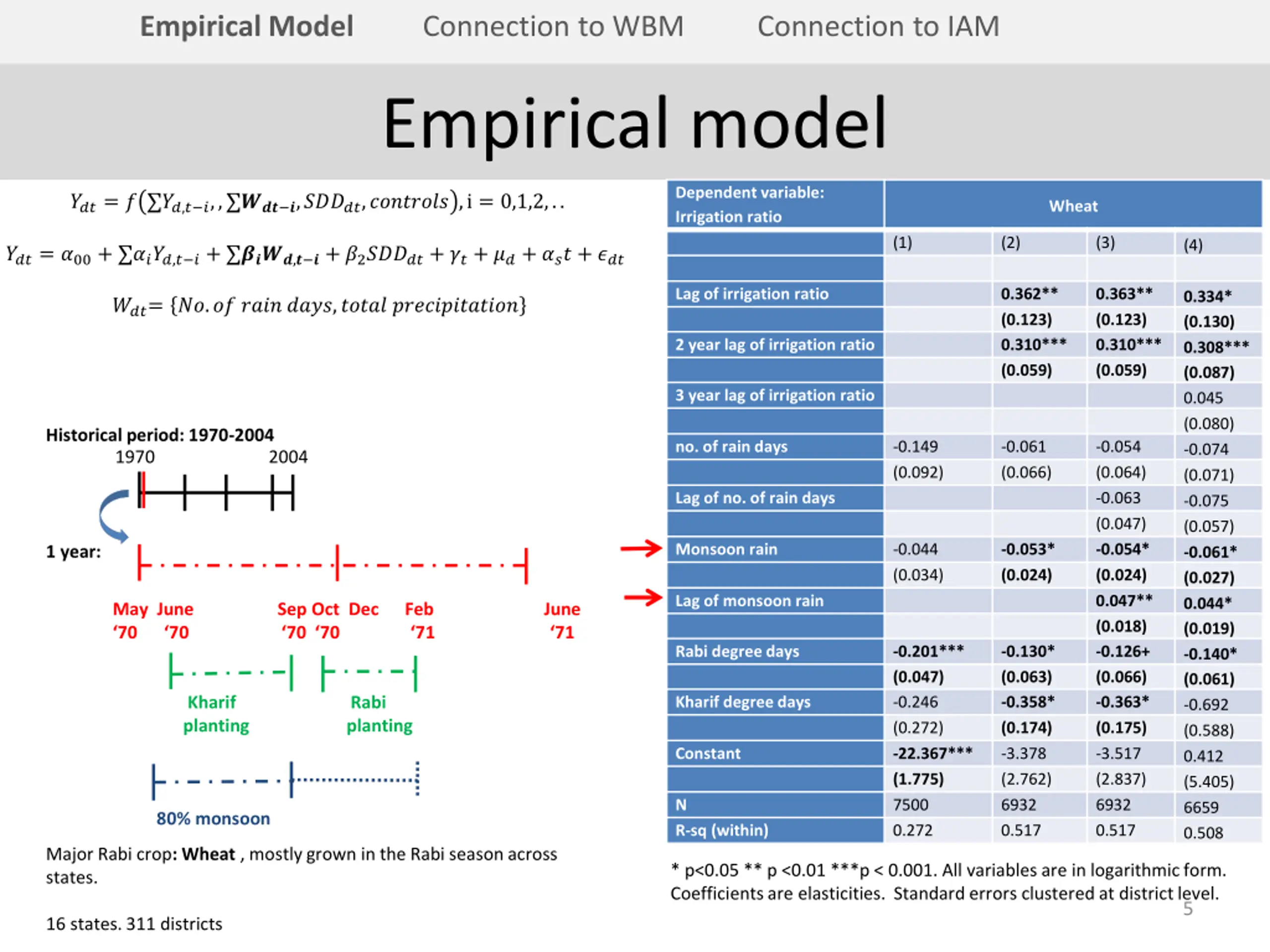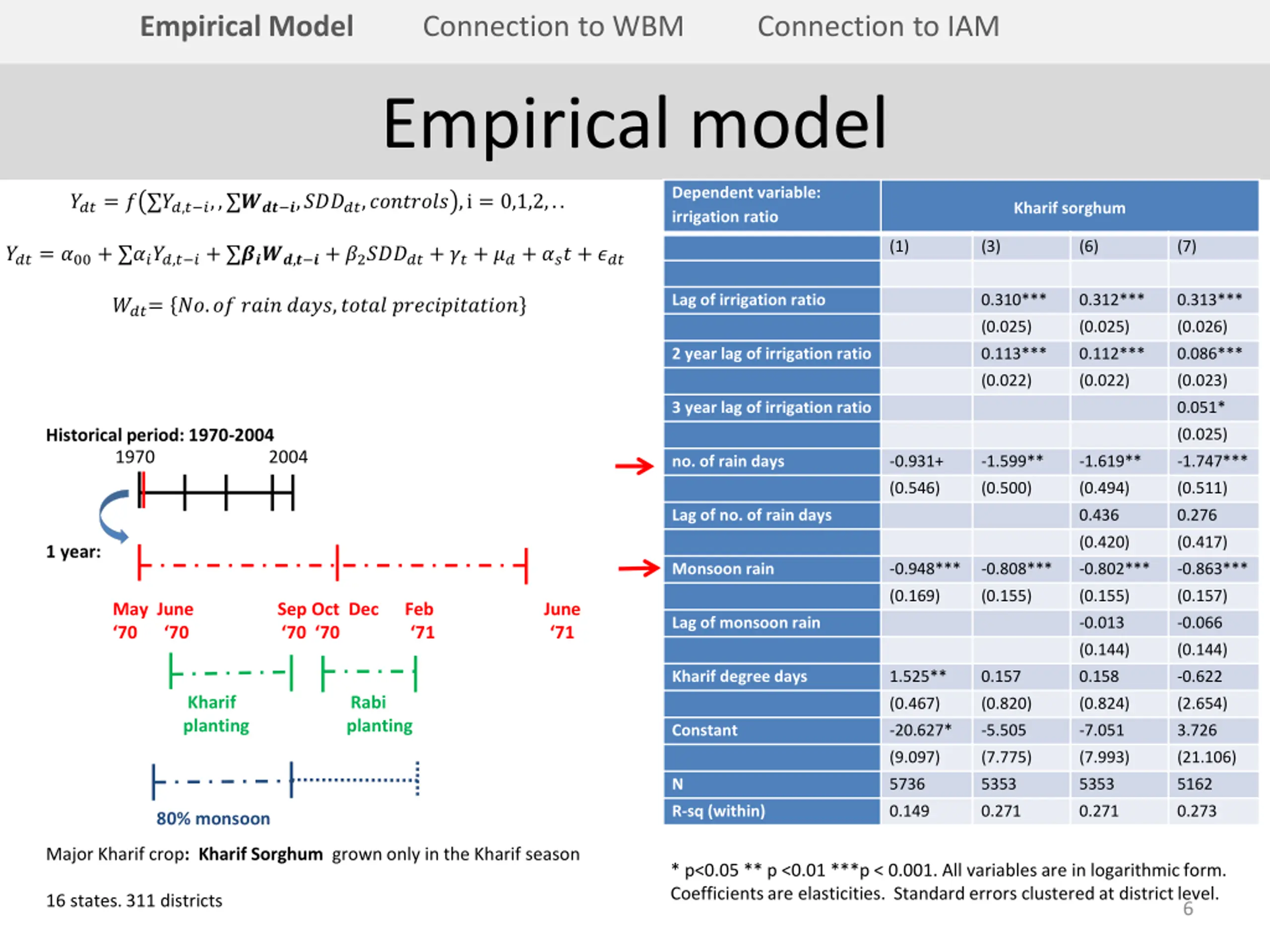 Empirical Model Connection to WBM Connection to IAM Empirical model Dependent variable: irrigation ratio ???= ? ??,? ?,, ??? ?,?????,???????? ,i = 0,1,2,.. Kharif sorghum (1) (3) (6) (7) ???= ?00+ ????,? ?+ ????,? ?+ ?2?????+ ??+ ??+ ??? + ??? Lag of irrigation ratio 0.310*** 0.312*** 0.313*** ???= ??.?? ???? ????,????? ????????????? (0.025) (0.025) (0.026) 2 year lag of irrigation ratio 0.113*** 0.112*** 0.086*** (0.022) (0.022) (0.023) 3 year lag of irrigation ratio 0.051* Historical period: 1970-2004 1970 (0.025) 2004 no. of rain days -0.931+ -1.599** -1.619** -1.747*** (0.546) (0.500) (0.494) (0.511) Lag of no. of rain days 0.436 0.276 (0.420) (0.417) 1 year: Monsoon rain -0.948*** -0.808*** -0.802*** -0.863*** (0.169) (0.155) (0.155) (0.157) May June Sep Oct Dec Feb June 70 70 70 70 71 71 Lag of monsoon rain -0.013 -0.066 (0.144) (0.144) Kharif degree days 1.525** 0.157 0.158 -0.622 Kharif Rabi planting (0.467) (0.820) (0.824) (2.654) planting Constant -20.627* -5.505 -7.051 3.726 (9.097) (7.775) (7.993) (21.106) 80% monsoon N 5736 5353 5353 5162 R-sq (within) 0.149 0.271 0.271 0.273 Major Kharif crop: Kharif Sorghum grown only in the Kharif season * p<0.05 ** p <0.01 ***p < 0.001. All variables are in logarithmic form. Coefficients are elasticities. Standard errors clustered at district level. 16 states. 311 districts 6