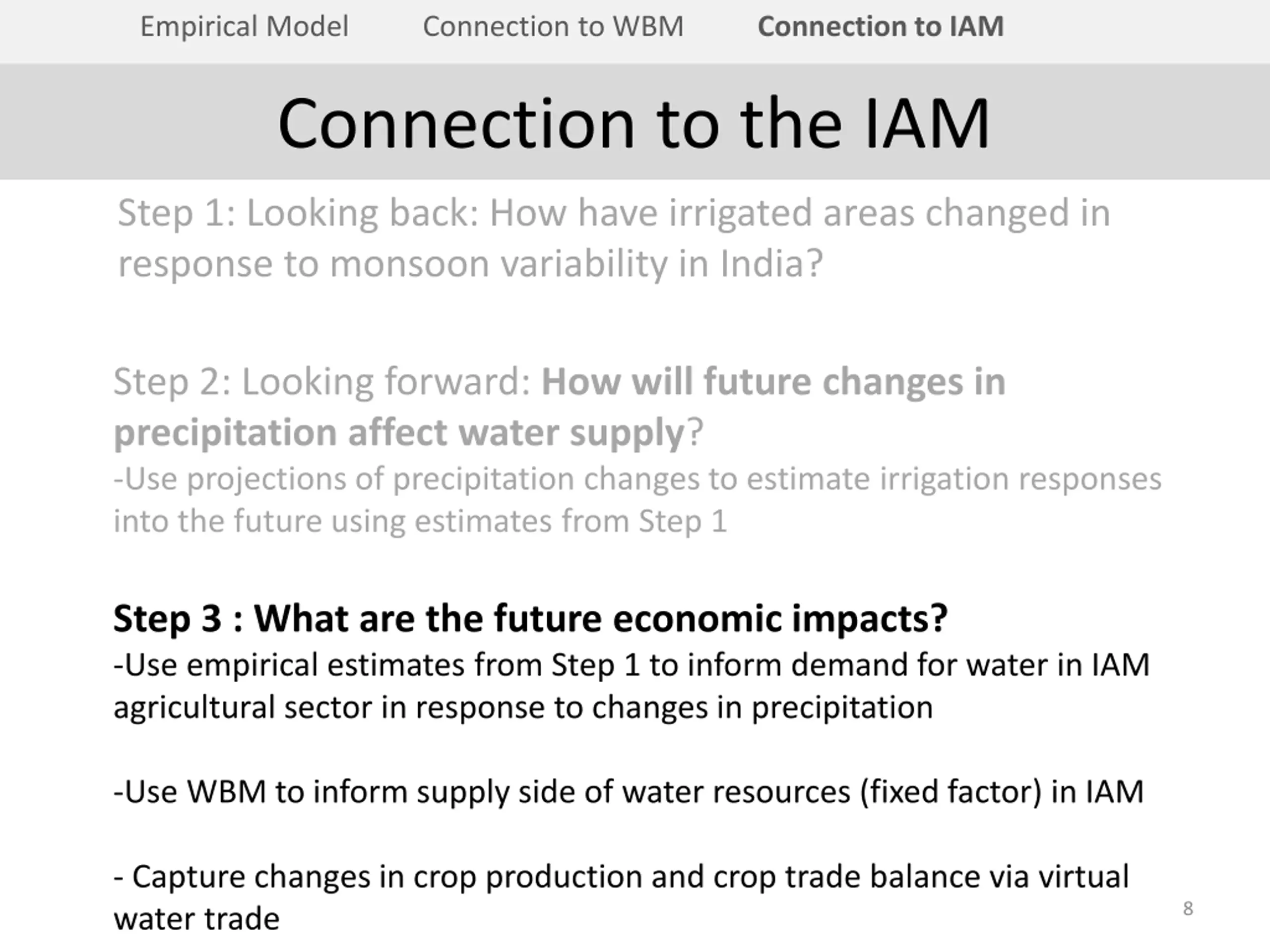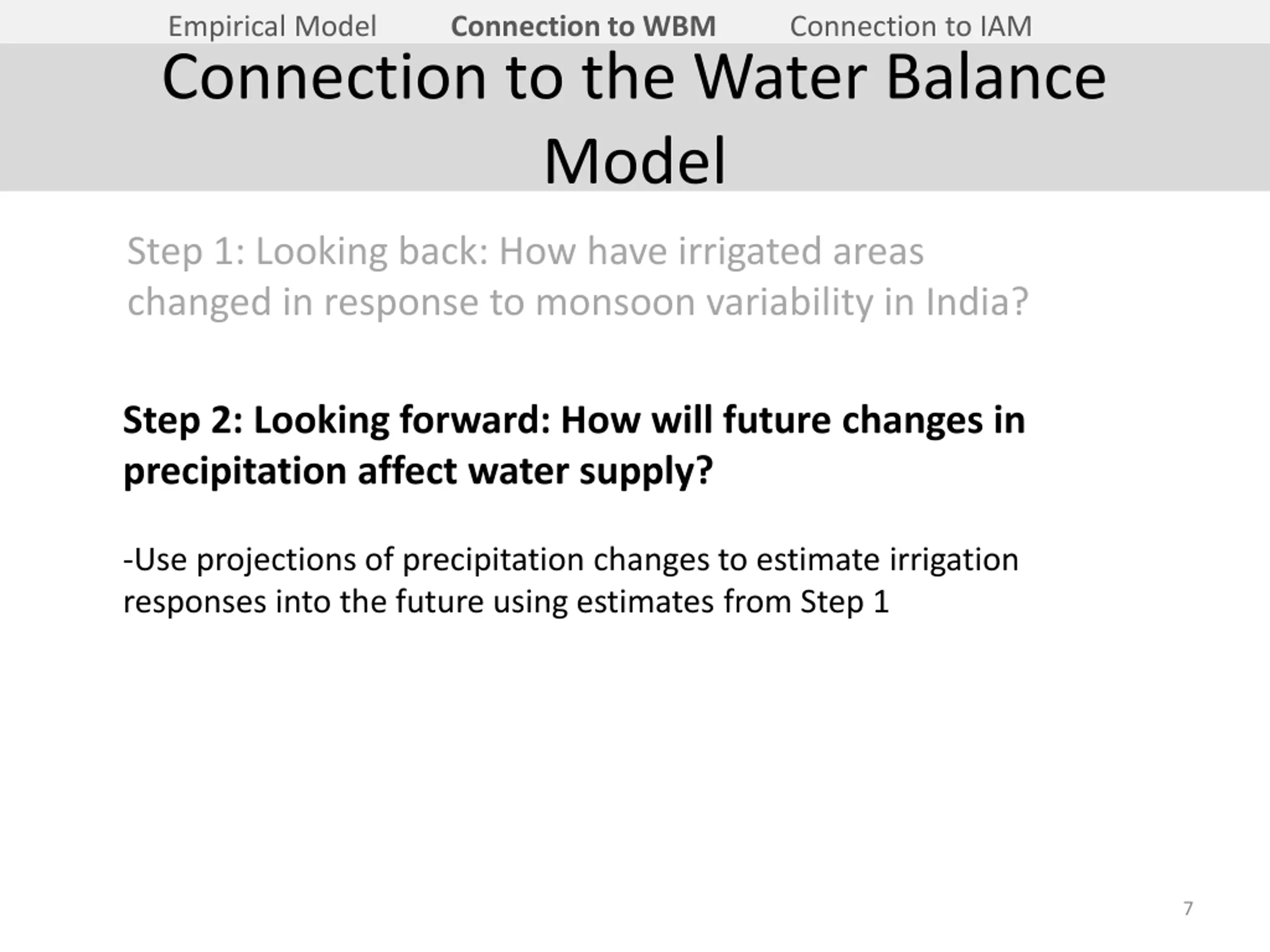 Empirical Model Connection to WBM Connection to IAM Connection to the Water Balance Model Step 1: Looking back: How have irrigated areas changed in response to monsoon variability in India? Step 2: Looking forward: How will future changes in precipitation affect water supply? -Use projections of precipitation changes to estimate irrigation responses into the future using estimates from Step 1 7
