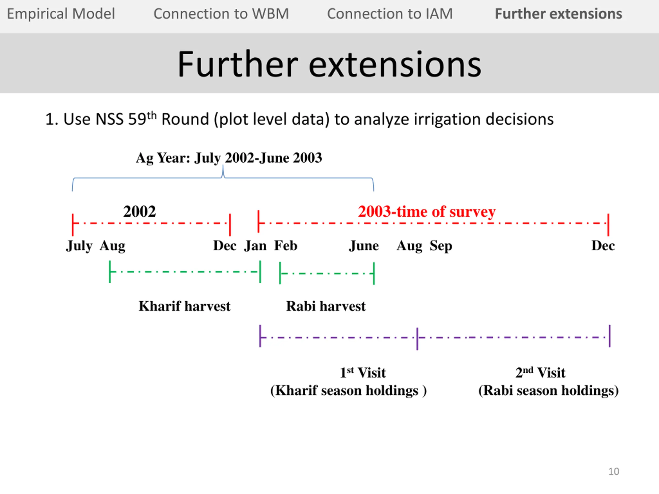 Empirical Model Connection to WBM Connection to IAM Further extensions Further extensions 1. Use NSS 59th Round (plot level data) to analyze irrigation decisions Ag Year: July 2002-June 2003 2002 2003-time of survey July Aug Dec Jan Feb June Aug Sep Dec Kharif harvest Rabi harvest 1st Visit 2nd Visit (Kharif season holdings ) (Rabi season holdings) 10