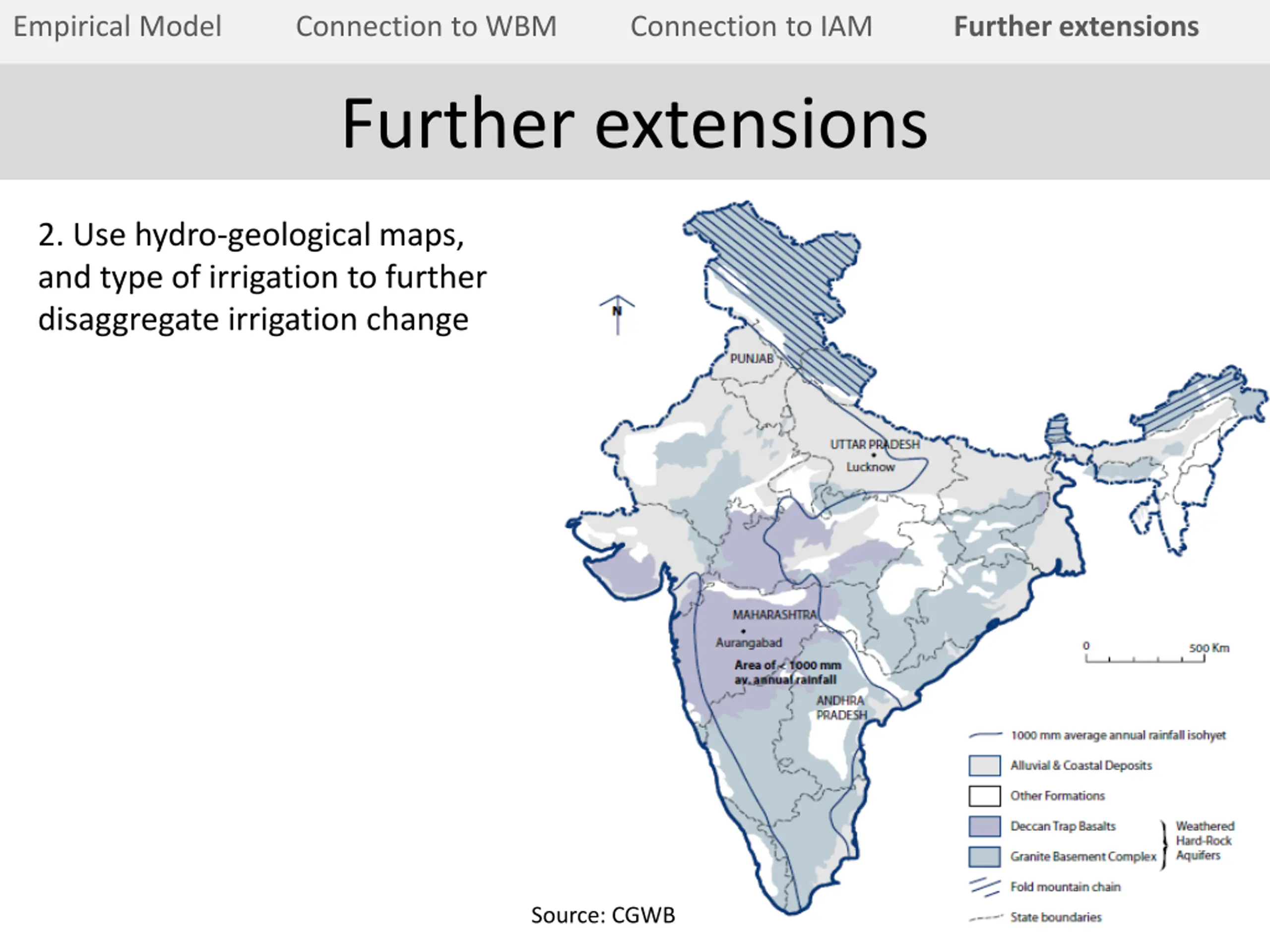 Empirical Model Connection to WBM Connection to IAM Further extensions Further extensions 2. Use hydro-geological maps, and type of irrigation to further disaggregate irrigation change 11 Source: CGWB
