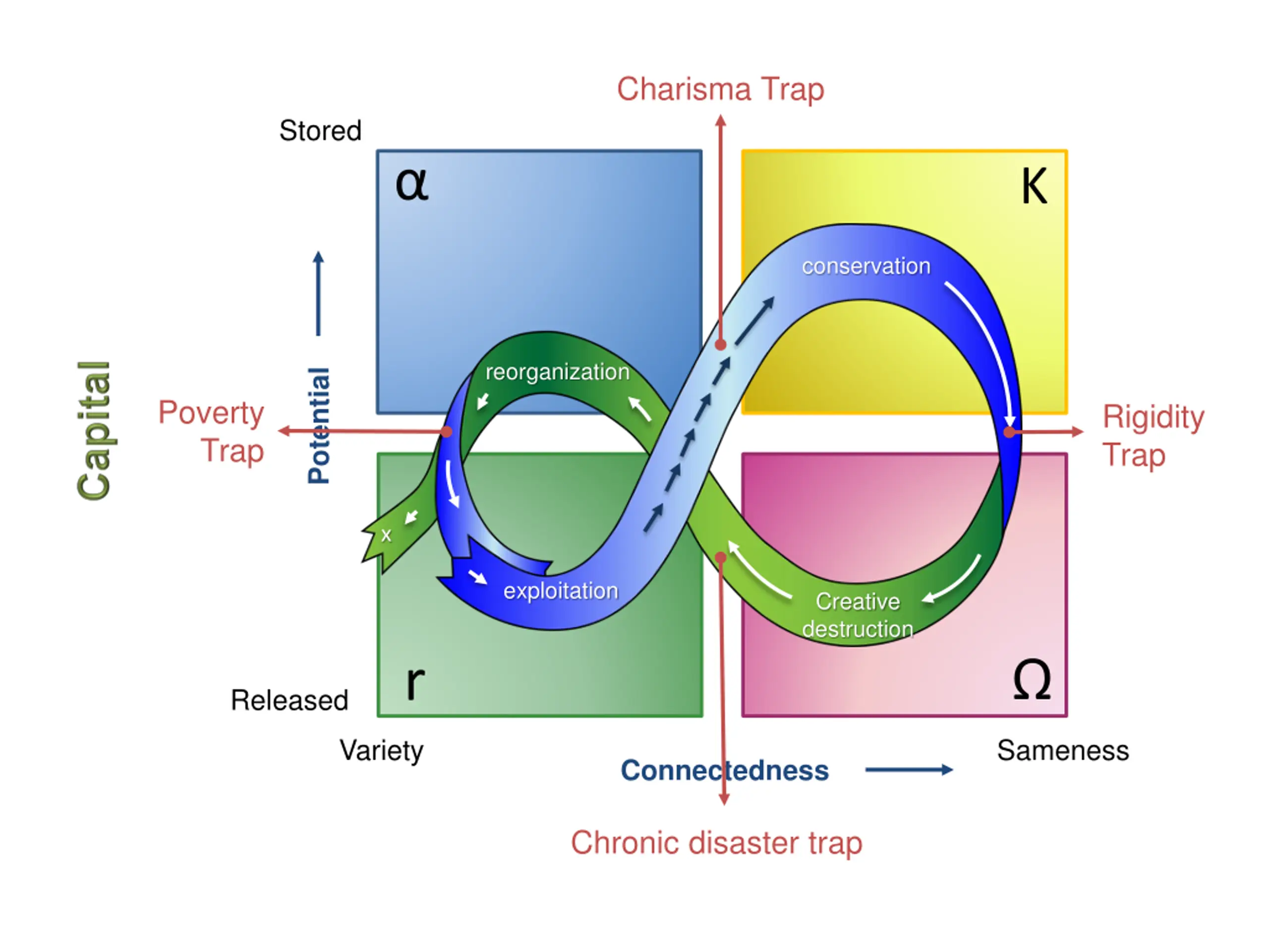 Charisma Trap Stored K conservation reorganization Potential Poverty Trap Rigidity Trap x exploitation Creative destruction r Released Variety Sameness Connectedness Chronic disaster trap
