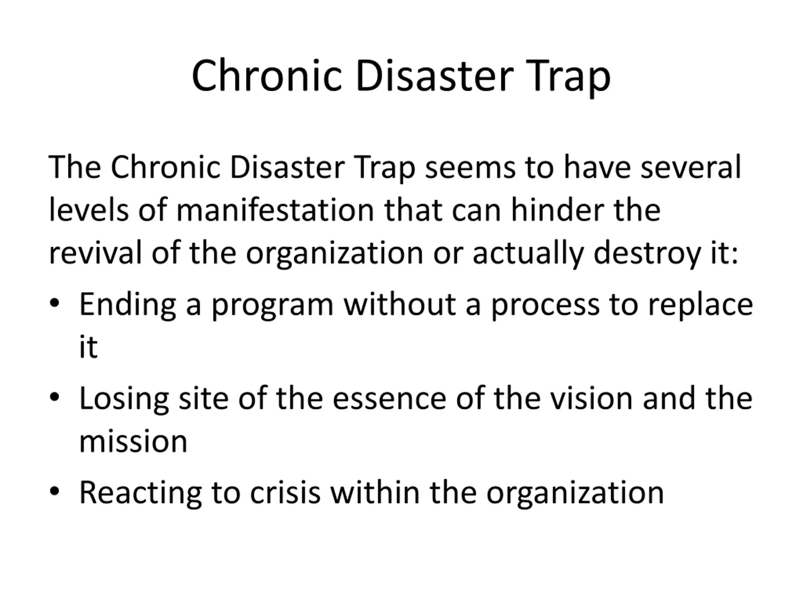 Chronic Disaster Trap The Chronic Disaster Trap seems to have several levels of manifestation that can hinder the revival of the organization or actually destroy it: Ending a program without a process to replace it Losing site of the essence of the vision and the mission Reacting to crisis within the organization