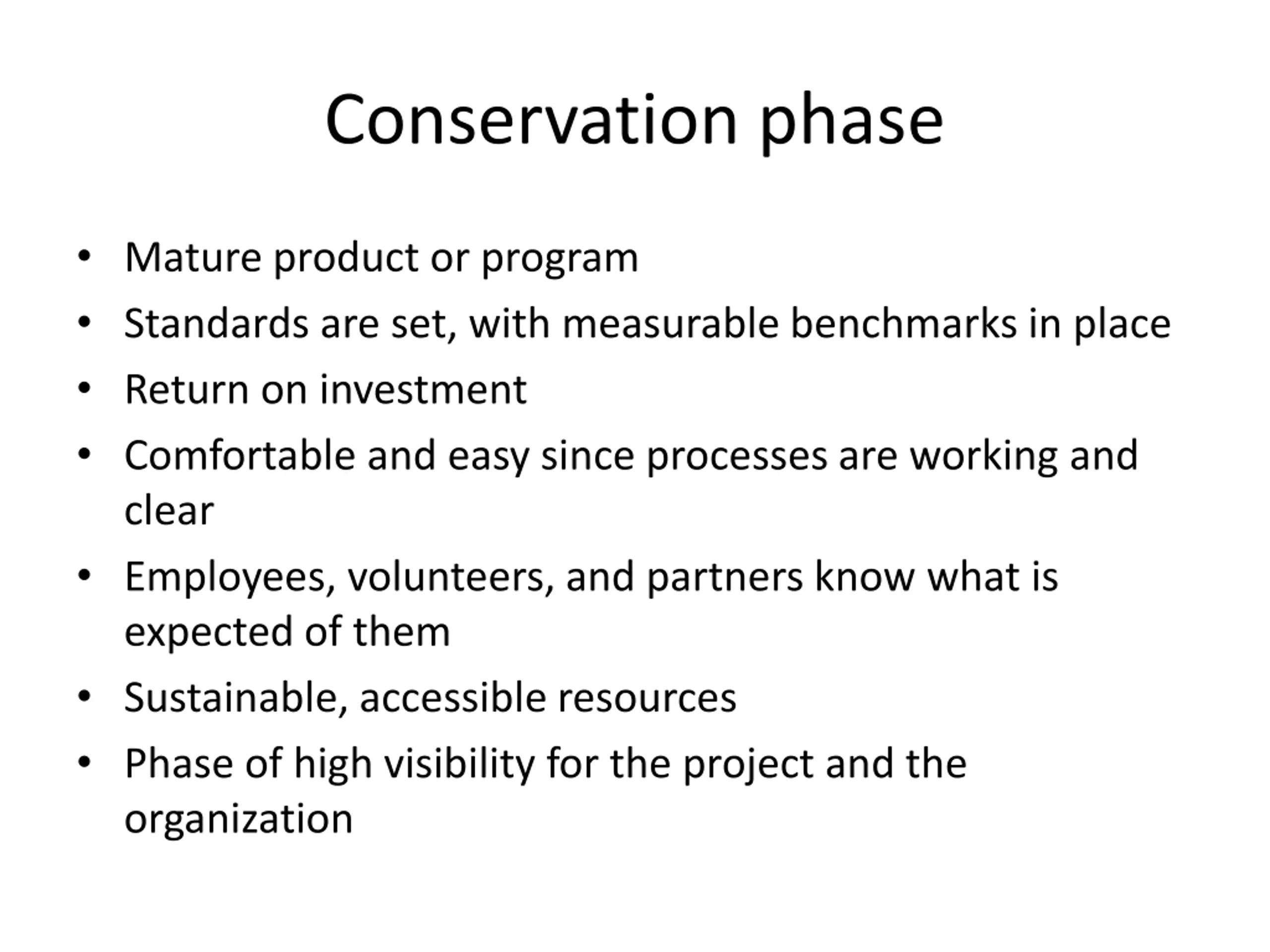 Conservation phase Mature product or program Standards are set, with measurable benchmarks in place Return on investment Comfortable and easy since processes are working and clear Employees, volunteers, and partners know what is expected of them Sustainable, accessible resources Phase of high visibility for the project and the organization