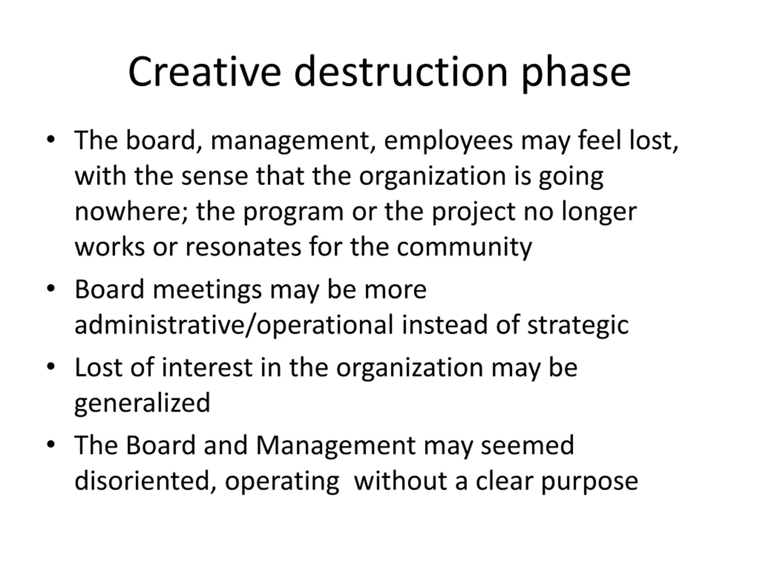 Creative destruction phase The board, management, employees may feel lost, with the sense that the organization is going nowhere; the program or the project no longer works or resonates for the community Board meetings may be more administrative/operational instead of strategic Lost of interest in the organization may be generalized The Board and Management may seemed disoriented, operating without a clear purpose