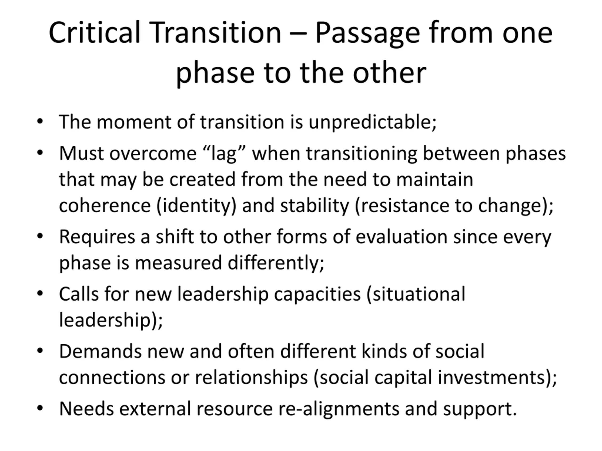 Critical Transition Passage from one phase to the other The moment of transition is unpredictable; Must overcome lag when transitioning between phases that may be created from the need to maintain coherence (identity) and stability (resistance to change); Requires a shift to other forms of evaluation since every phase is measured differently; Calls for new leadership capacities (situational leadership); Demands new and often different kinds of social connections or relationships (social capital investments); Needs external resource re-alignments and support.