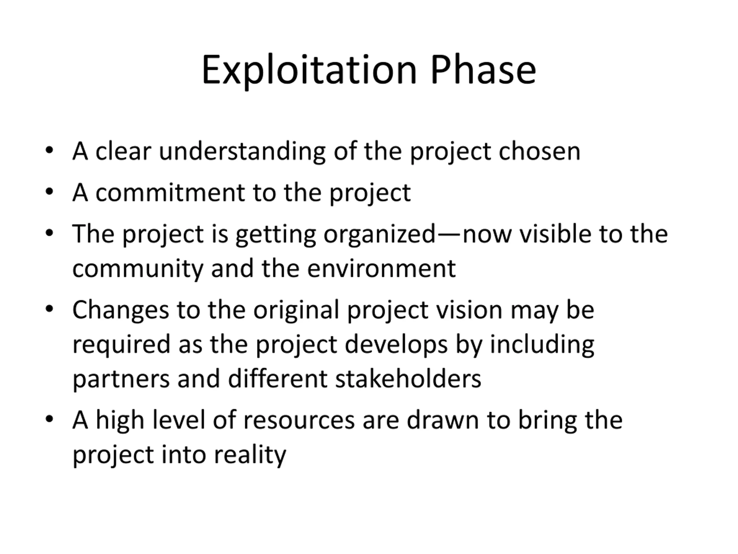 Exploitation Phase A clear understanding of the project chosen A commitment to the project The project is getting organized now visible to the community and the environment Changes to the original project vision may be required as the project develops by including partners and different stakeholders A high level of resources are drawn to bring the project into reality