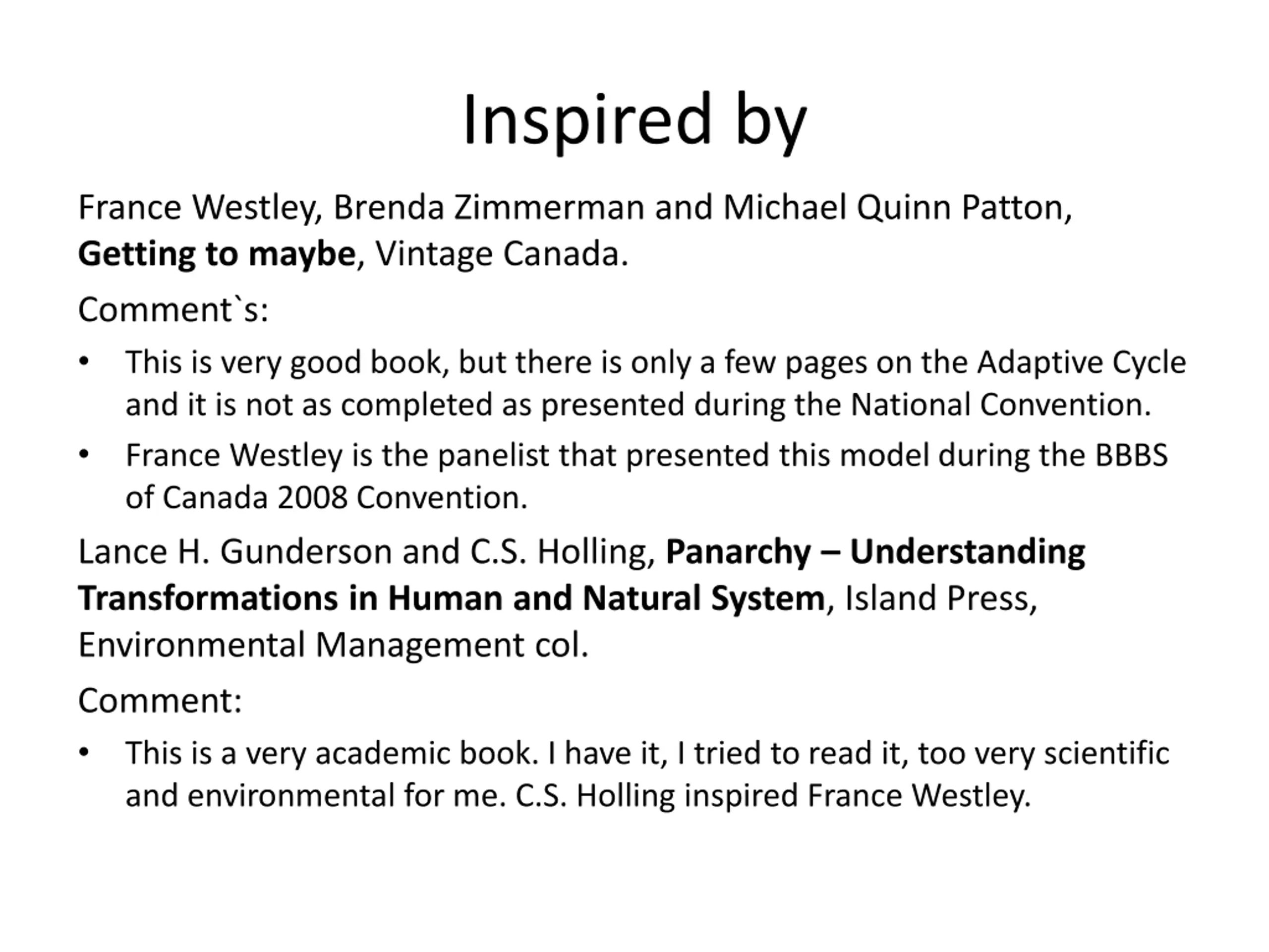 Inspired by France Westley, Brenda Zimmerman and Michael Quinn Patton, Getting to maybe, Vintage Canada. Comment`s: This is very good book, but there is only a few pages on the Adaptive Cycle and it is not as completed as presented during the National Convention. France Westley is the panelist that presented this model during the BBBS of Canada 2008 Convention. Lance H. Gunderson and C.S. Holling, Panarchy Understanding Transformations in Human and Natural System, Island Press, Environmental Management col. Comment: This is a very academic book. I have it, I tried to read it, too very scientific and environmental for me. C.S. Holling inspired France Westley.