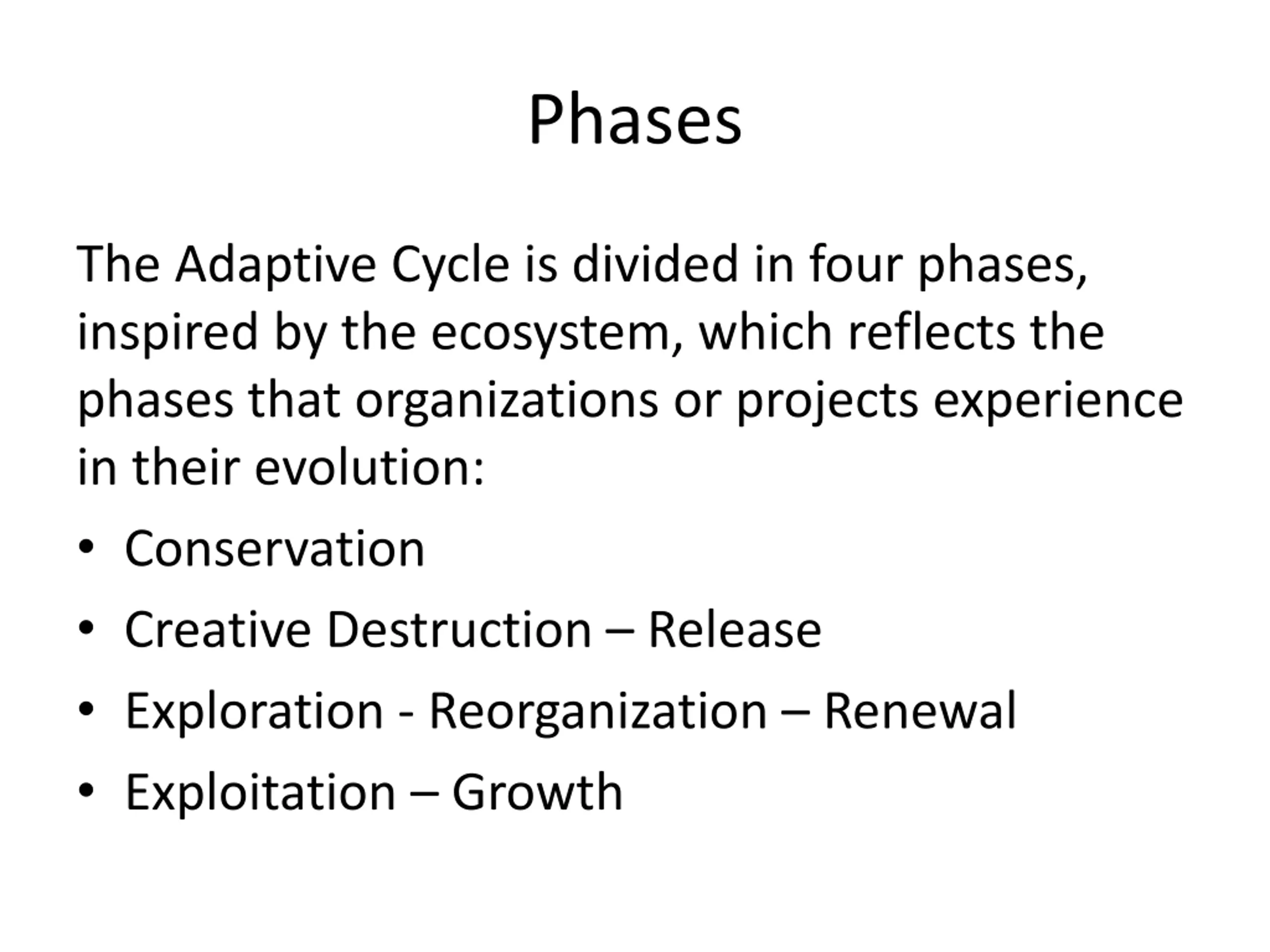 Phases The Adaptive Cycle is divided in four phases, inspired by the ecosystem, which reflects the phases that organizations or projects experience in their evolution: Conservation Creative Destruction Release Exploration - Reorganization Renewal Exploitation Growth