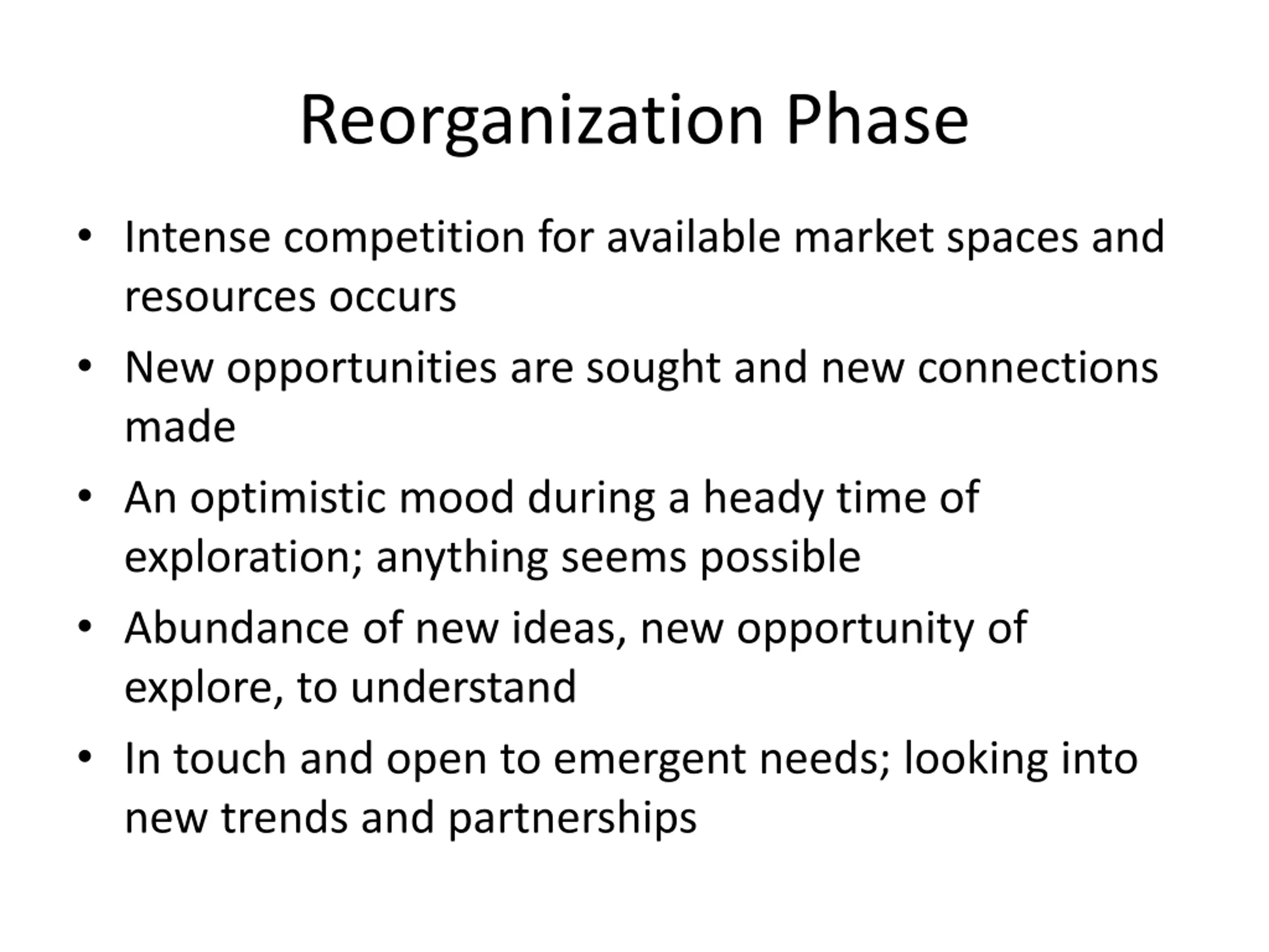Reorganization Phase Intense competition for available market spaces and resources occurs New opportunities are sought and new connections made An optimistic mood during a heady time of exploration; anything seems possible Abundance of new ideas, new opportunity of explore, to understand In touch and open to emergent needs; looking into new trends and partnerships