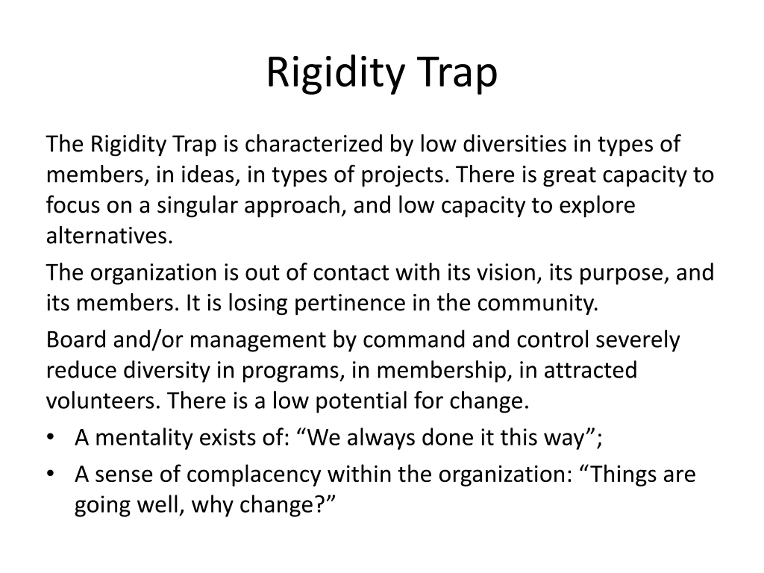 Rigidity Trap The Rigidity Trap is characterized by low diversities in types of members, in ideas, in types of projects. There is great capacity to focus on a singular approach, and low capacity to explore alternatives. The organization is out of contact with its vision, its purpose, and its members. It is losing pertinence in the community. Board and/or management by command and control severely reduce diversity in programs, in membership, in attracted volunteers. There is a low potential for change. A mentality exists of: We always done it this way ; A sense of complacency within the organization: Things are going well, why change?