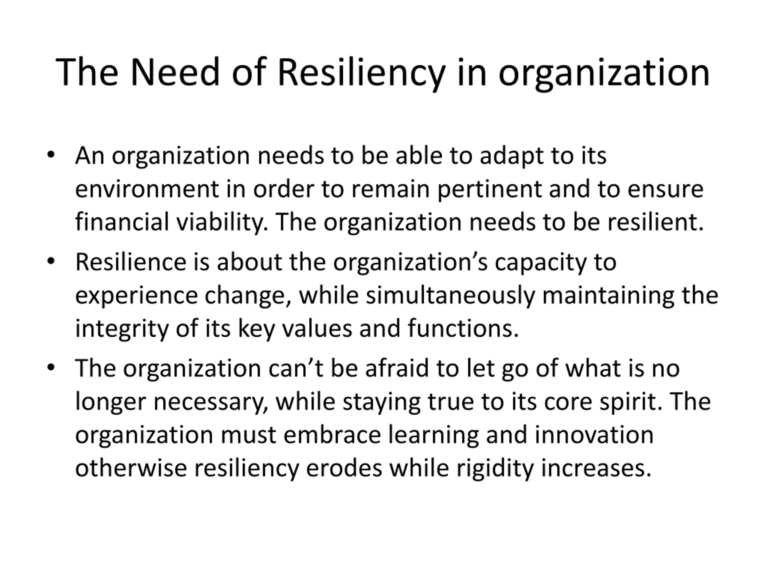 The Need of Resiliency in organization An organization needs to be able to adapt to its environment in order to remain pertinent and to ensure financial viability. The organization needs to be resilient. Resilience is about the organization s capacity to experience change, while simultaneously maintaining the integrity of its key values and functions. The organization can t be afraid to let go of what is no longer necessary, while staying true to its core spirit. The organization must embrace learning and innovation otherwise resiliency erodes while rigidity increases.