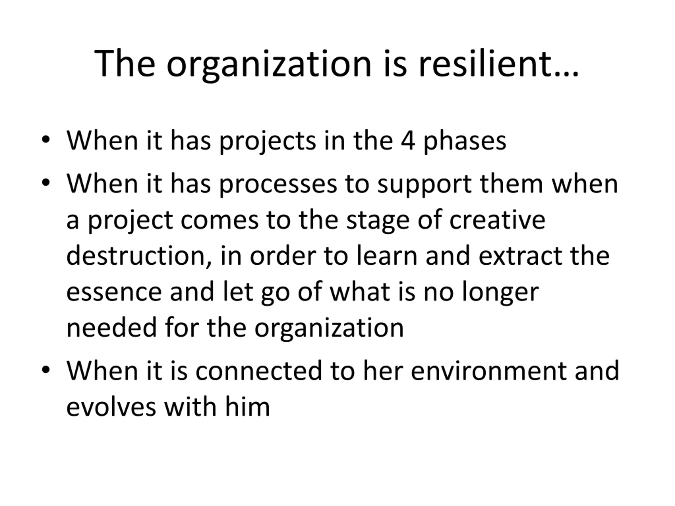 The organization is resilient When it has projects in the 4 phases When it has processes to support them when a project comes to the stage of creative destruction, in order to learn and extract the essence and let go of what is no longer needed for the organization When it is connected to her environment and evolves with him