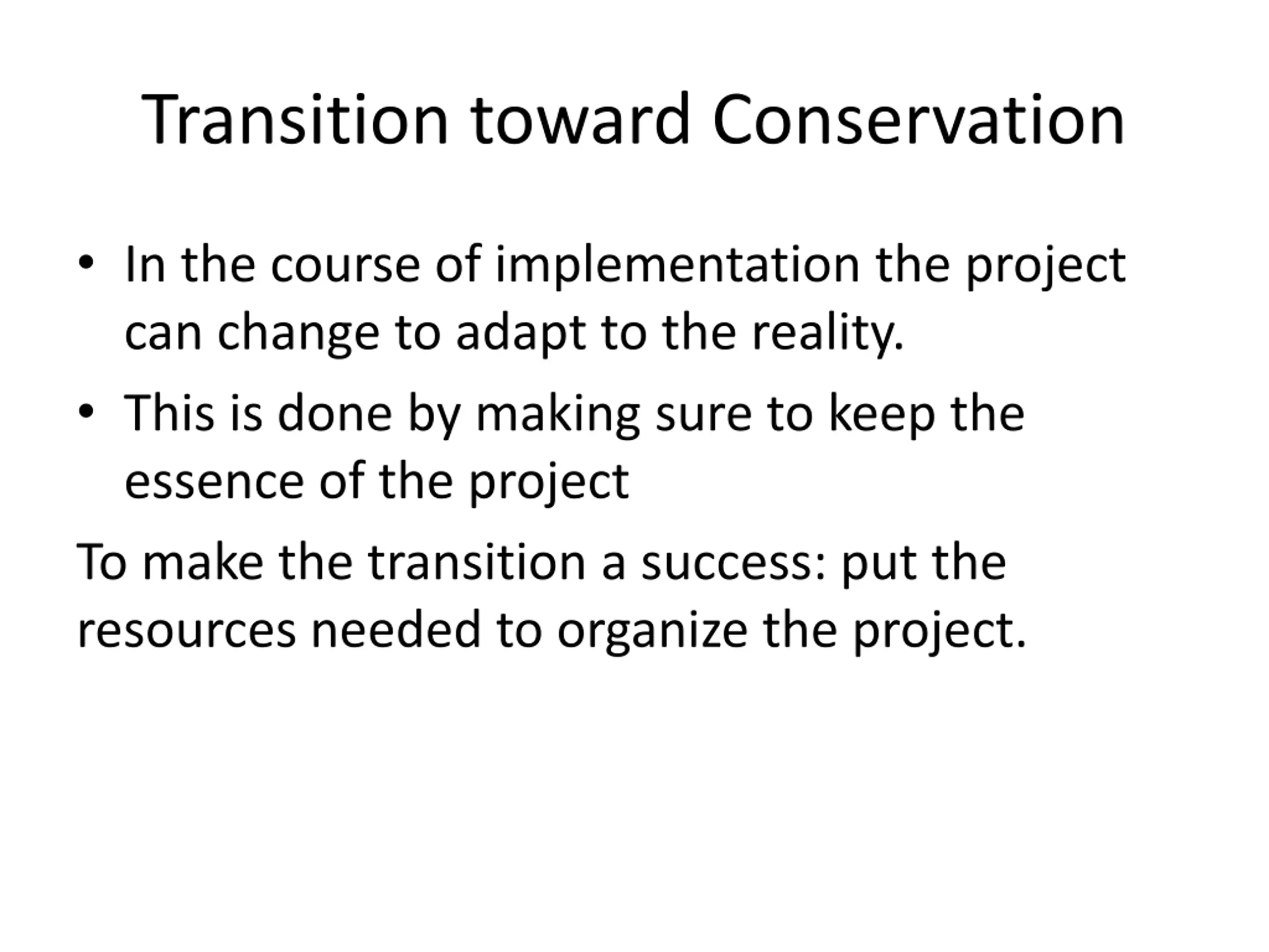 Transition toward Conservation In the course of implementation the project can change to adapt to the reality. This is done by making sure to keep the essence of the project To make the transition a success: put the resources needed to organize the project.