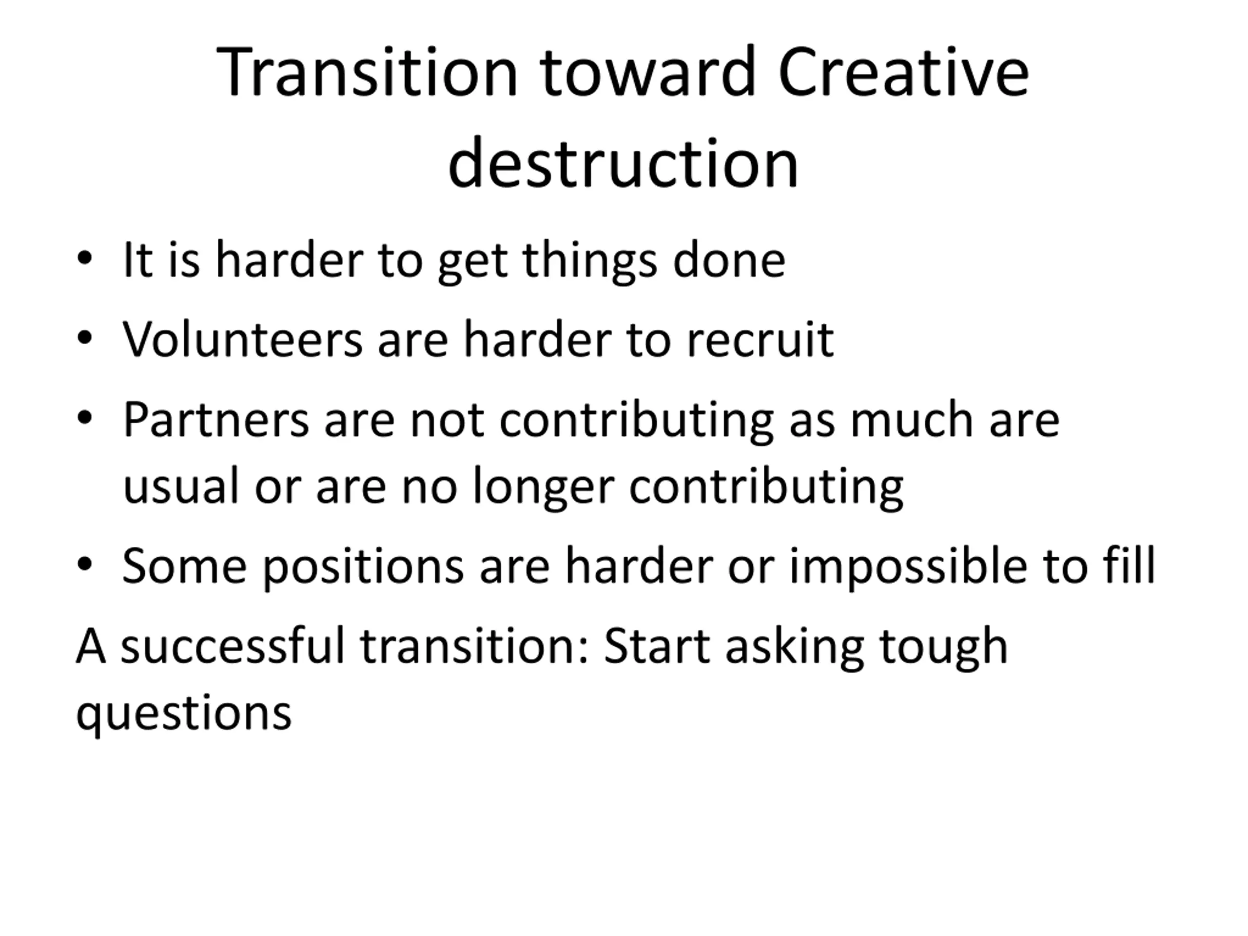 Transition toward Creative destruction It is harder to get things done Volunteers are harder to recruit Partners are not contributing as much are usual or are no longer contributing Some positions are harder or impossible to fill A successful transition: Start asking tough questions