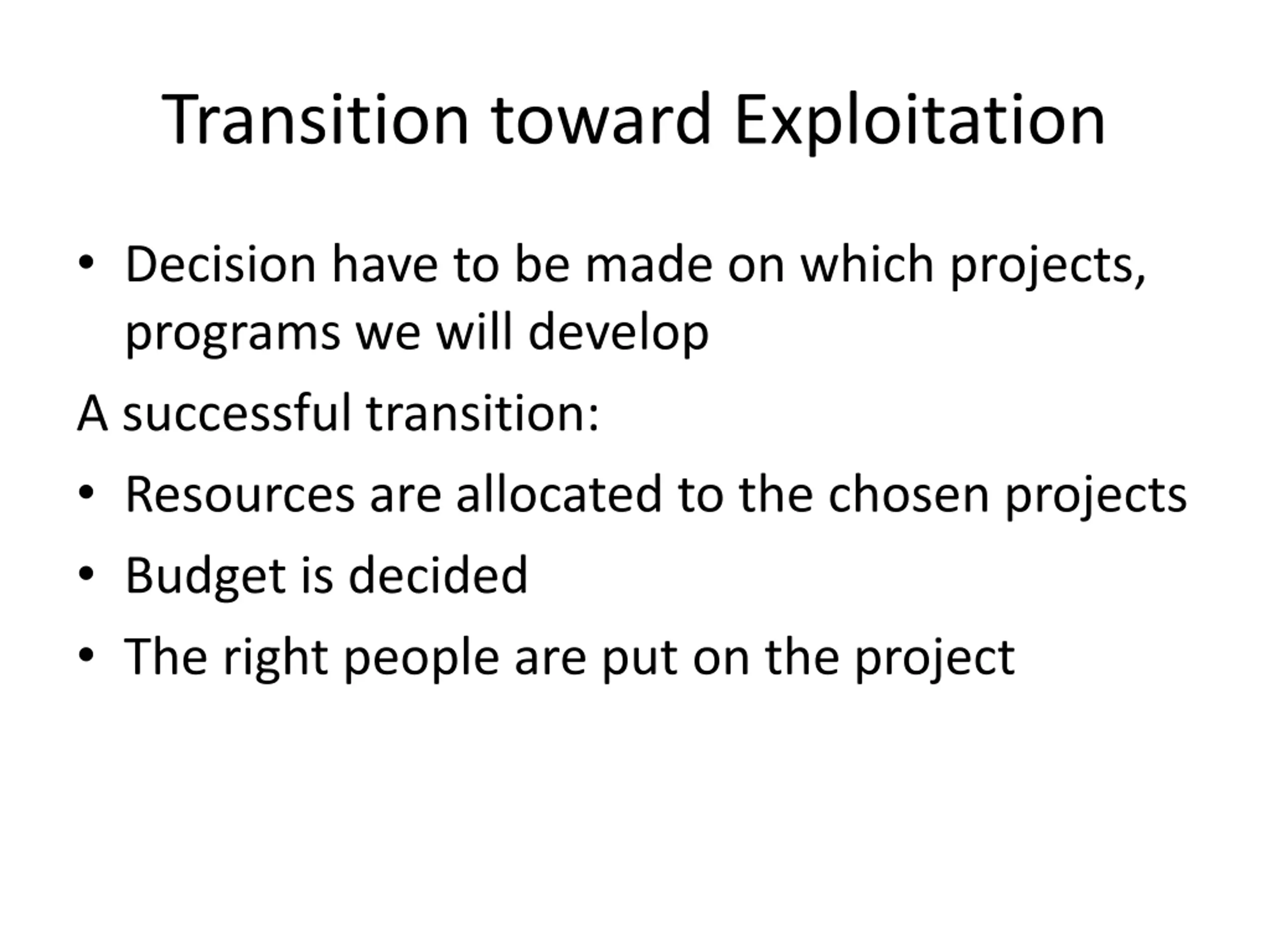 Transition toward Exploitation Decision have to be made on which projects, programs we will develop A successful transition: Resources are allocated to the chosen projects Budget is decided The right people are put on the project