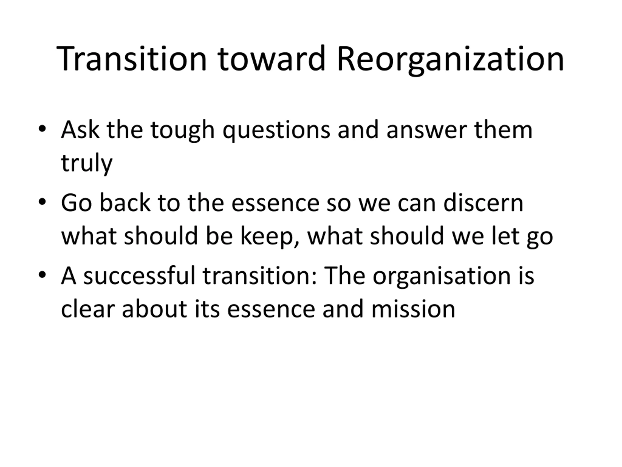 Transition toward Reorganization Ask the tough questions and answer them truly Go back to the essence so we can discern what should be keep, what should we let go A successful transition: The organisation is clear about its essence and mission