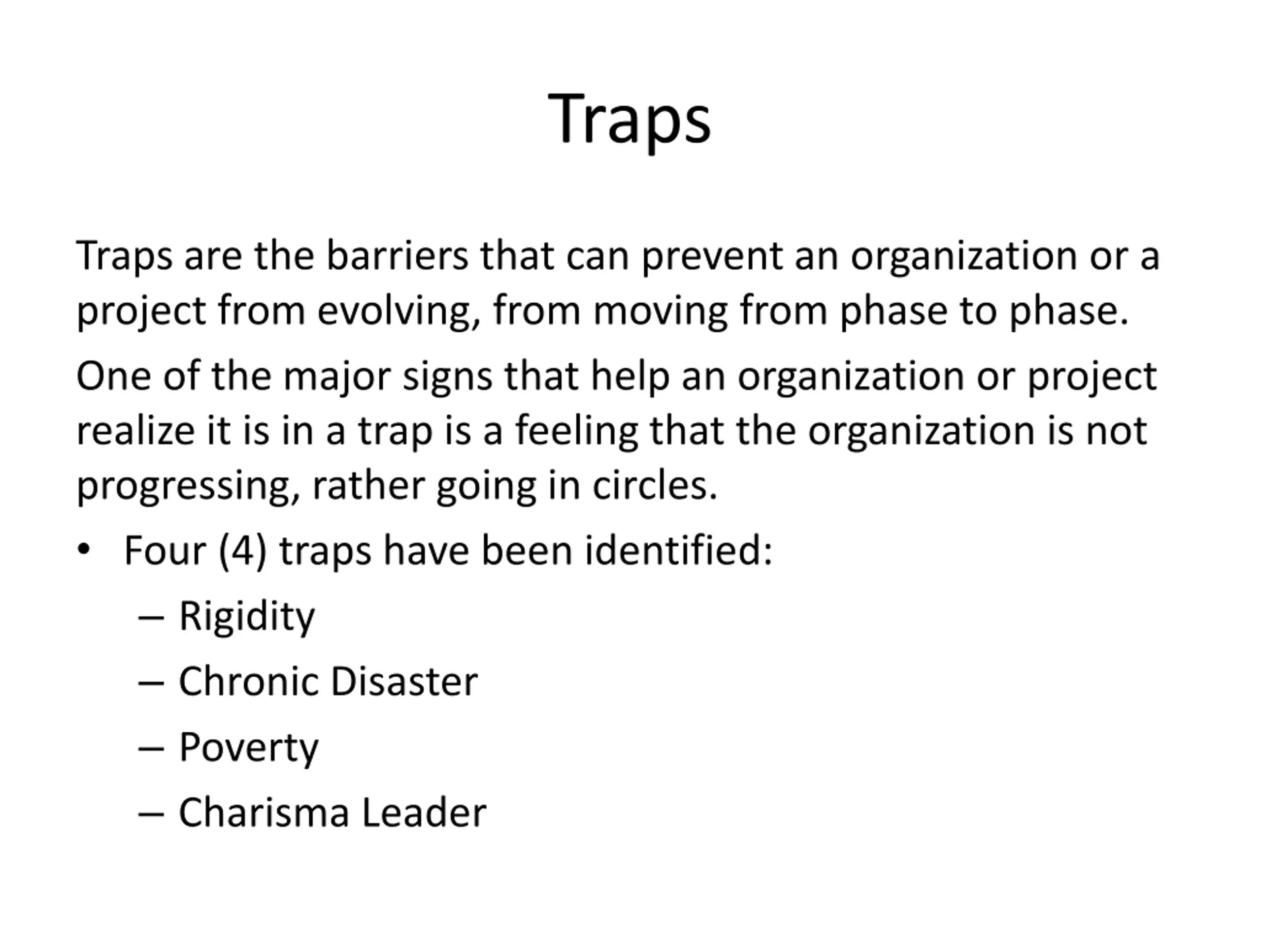 Traps Traps are the barriers that can prevent an organization or a project from evolving, from moving from phase to phase. One of the major signs that help an organization or project realize it is in a trap is a feeling that the organization is not progressing, rather going in circles. Four (4) traps have been identified: Rigidity Chronic Disaster Poverty Charisma Leader