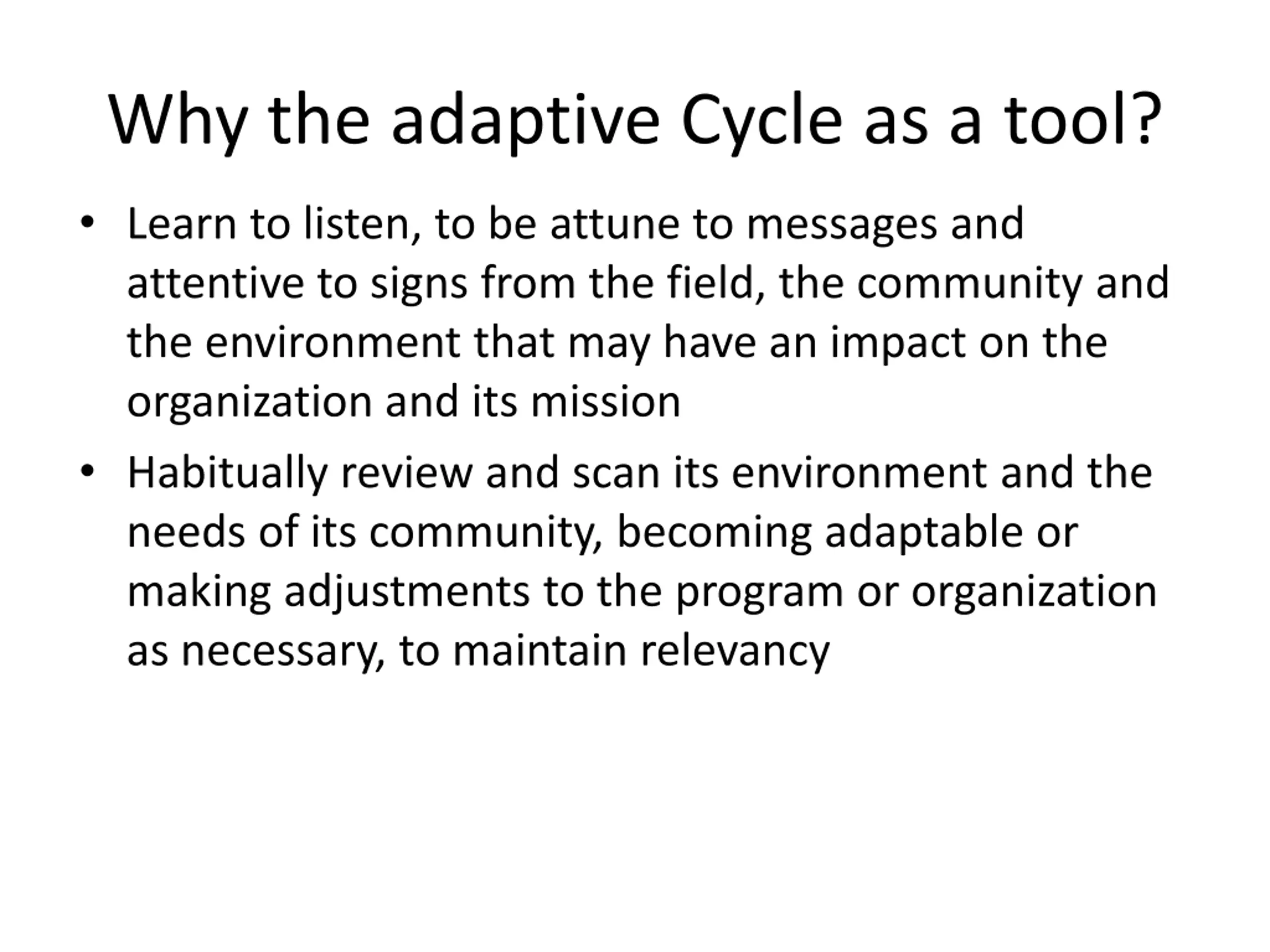 Why the adaptive Cycle as a tool? Learn to listen, to be attune to messages and attentive to signs from the field, the community and the environment that may have an impact on the organization and its mission Habitually review and scan its environment and the needs of its community, becoming adaptable or making adjustments to the program or organization as necessary, to maintain relevancy