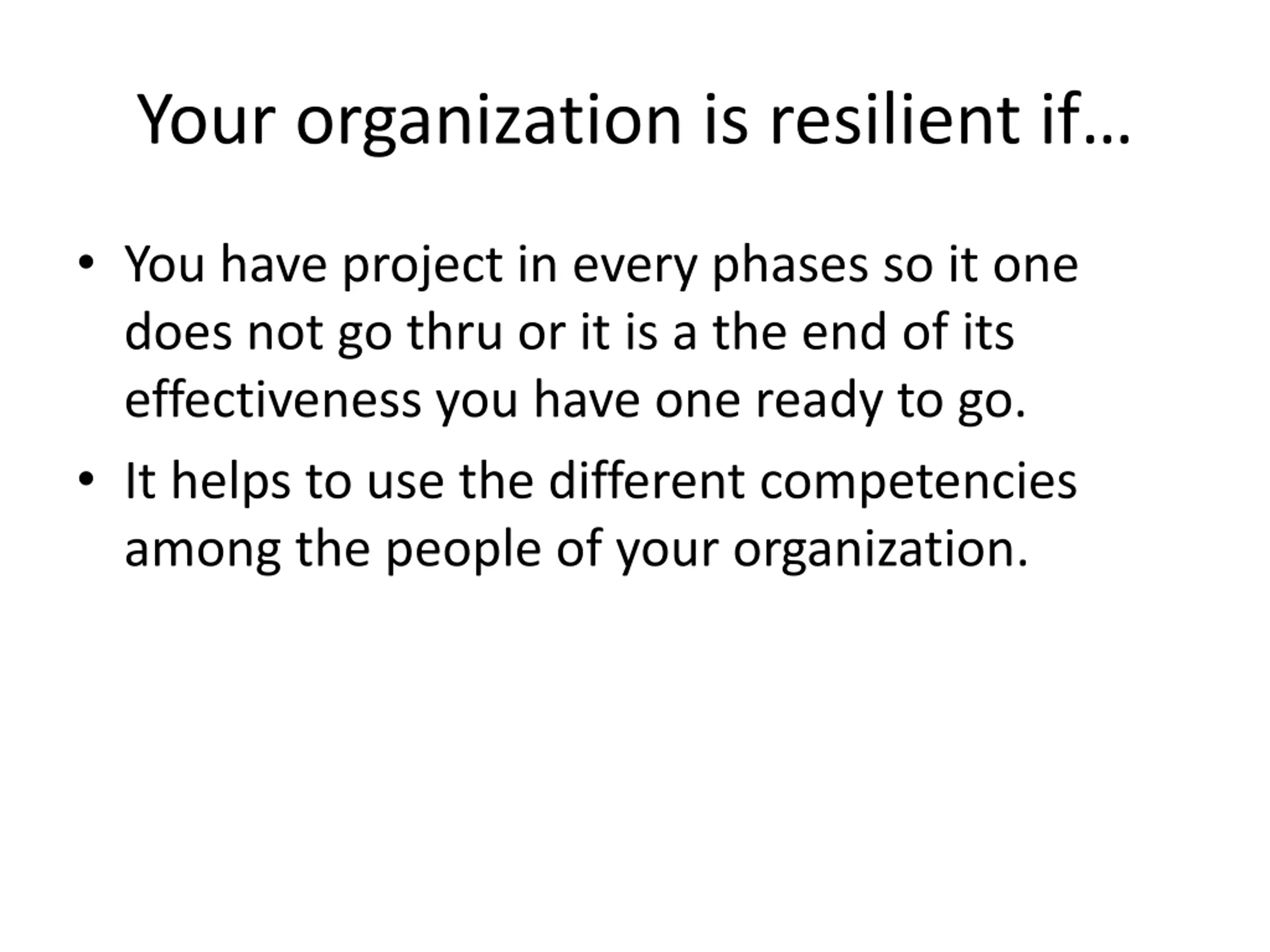 Your organization is resilient if You have project in every phases so it one does not go thru or it is a the end of its effectiveness you have one ready to go. It helps to use the different competencies among the people of your organization.