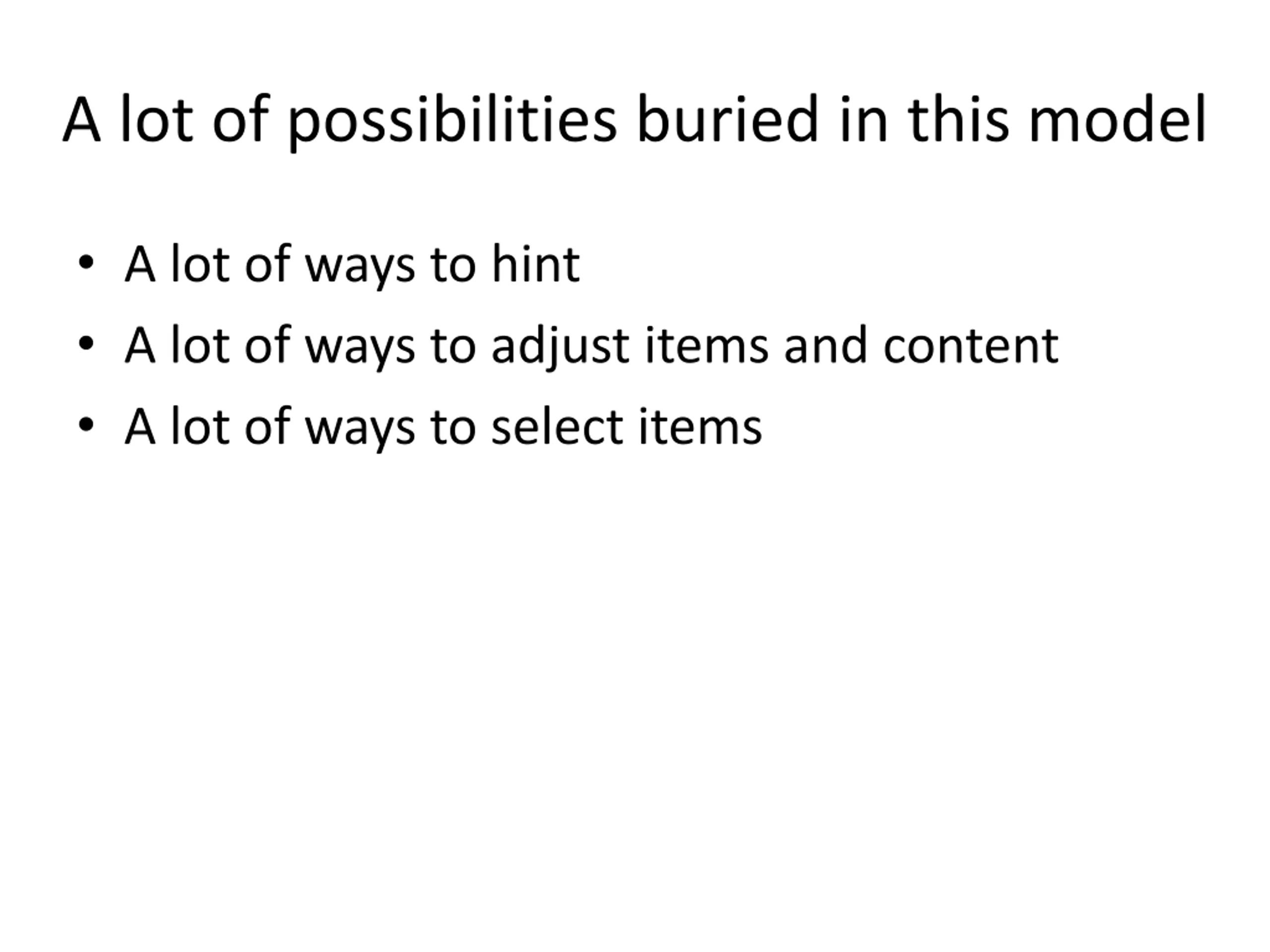 A lot of possibilities buried in this model A lot of ways to hint A lot of ways to adjust items and content A lot of ways to select items
