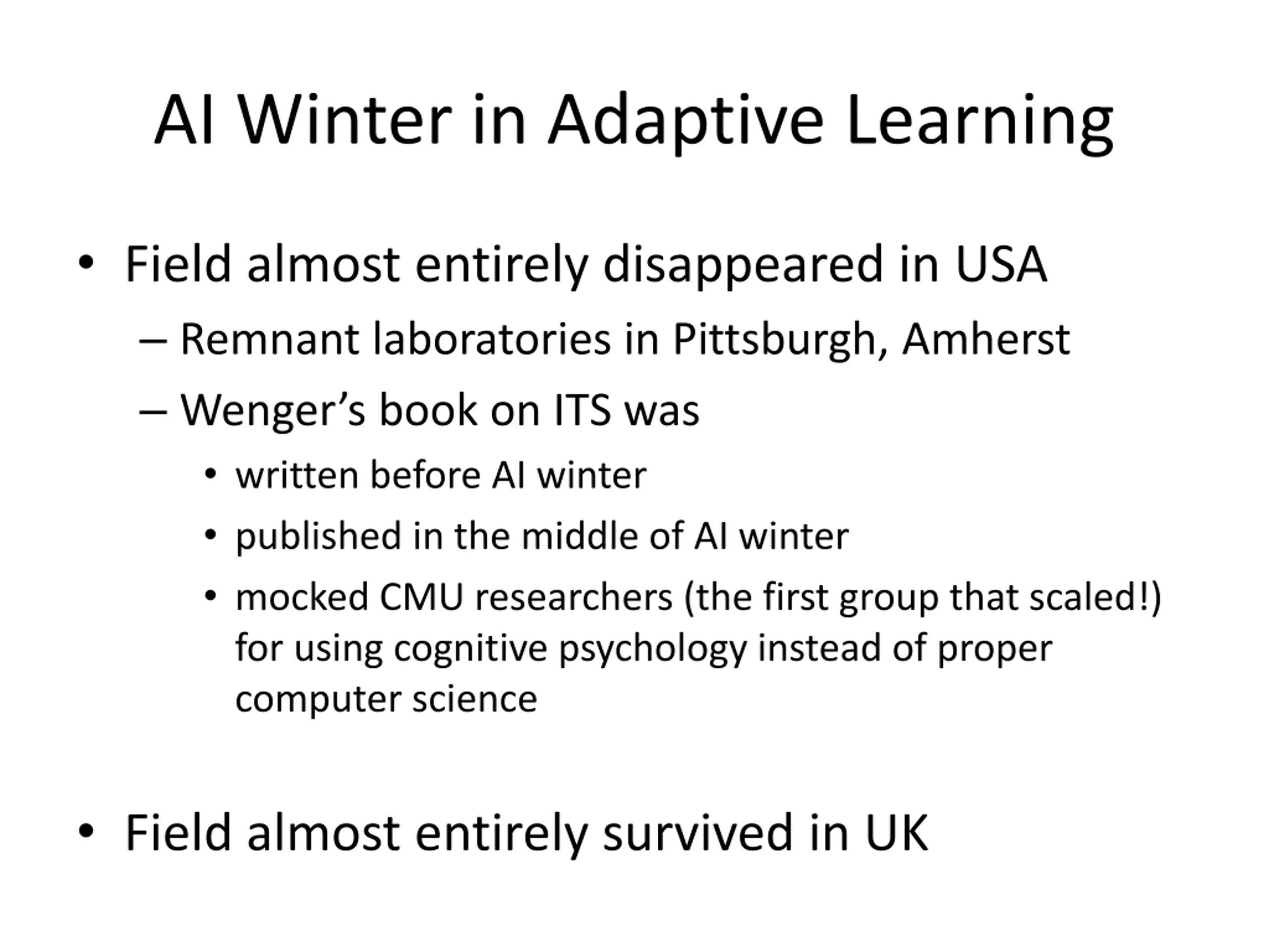 AI Winter in Adaptive Learning Field almost entirely disappeared in USA Remnant laboratories in Pittsburgh, Amherst Wenger s book on ITS was written before AI winter published in the middle of AI winter mocked CMU researchers (the first group that scaled!) for using cognitive psychology instead of proper computer science Field almost entirely survived in UK