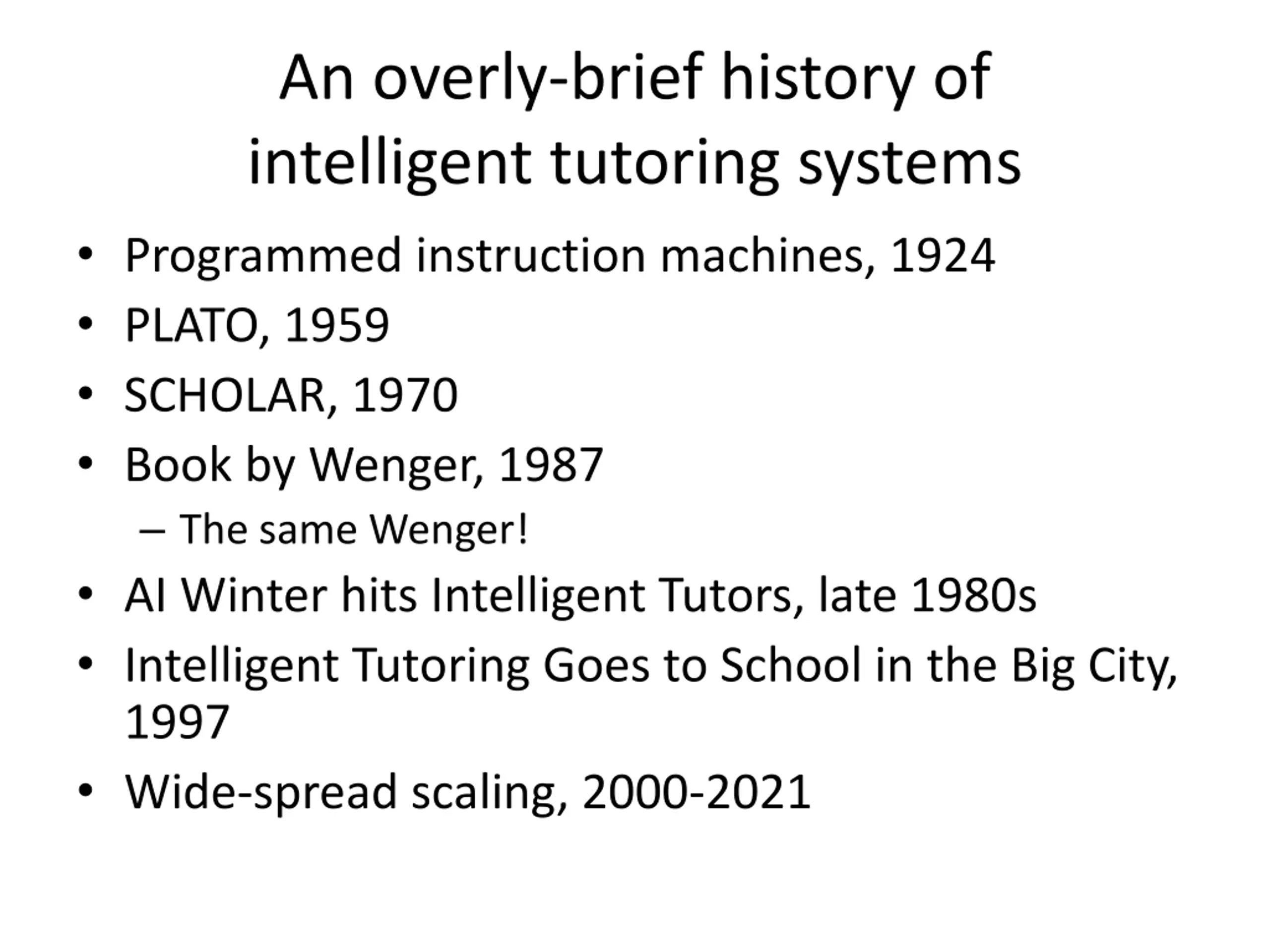 An overly-brief history of intelligent tutoring systems Programmed instruction machines, 1924 PLATO, 1959 SCHOLAR, 1970 Book by Wenger, 1987 The same Wenger! AI Winter hits Intelligent Tutors, late 1980s Intelligent Tutoring Goes to School in the Big City, 1997 Wide-spread scaling, 2000-2021