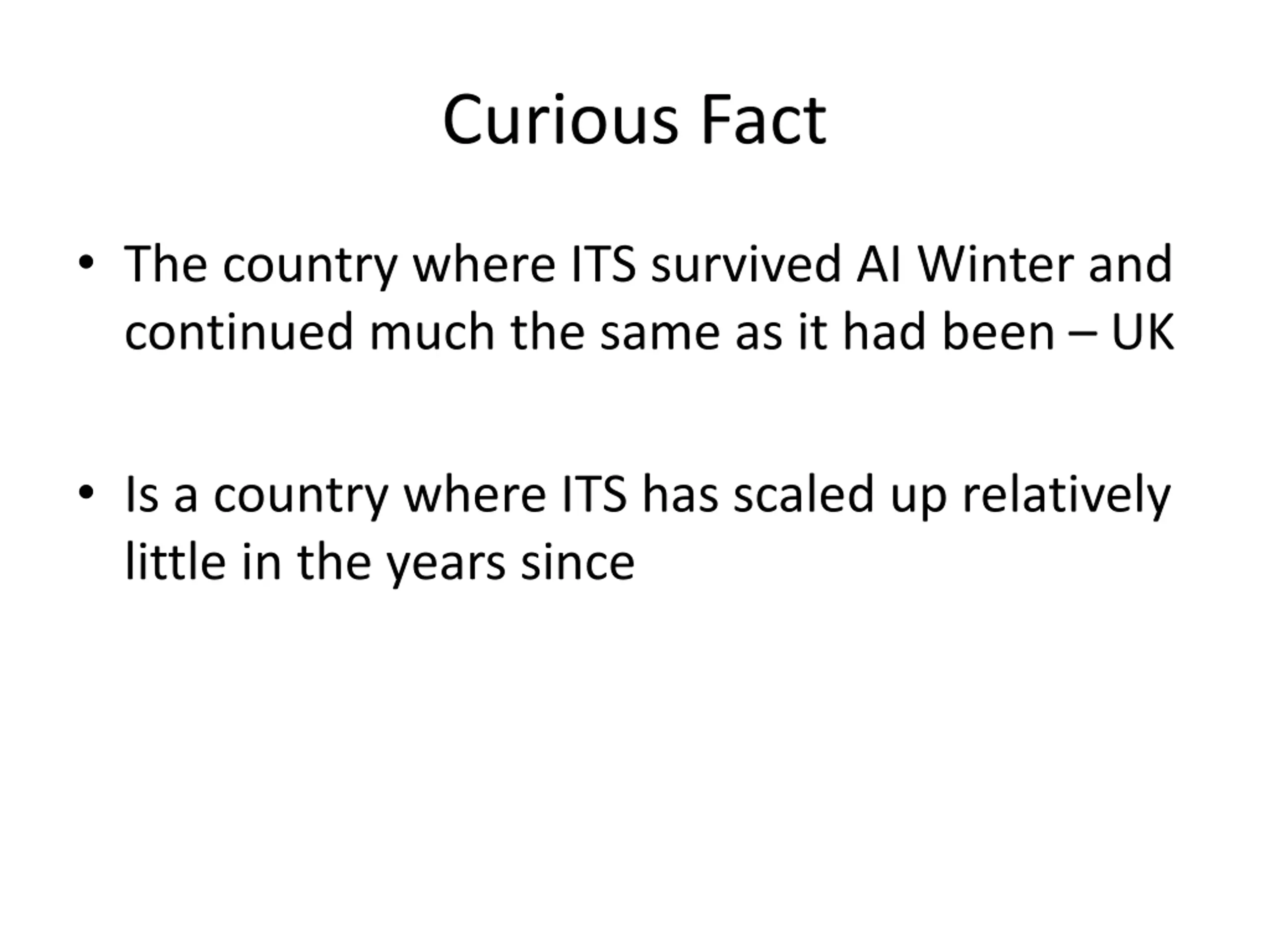 Curious Fact The country where ITS survived AI Winter and continued much the same as it had been UK Is a country where ITS has scaled up relatively little in the years since