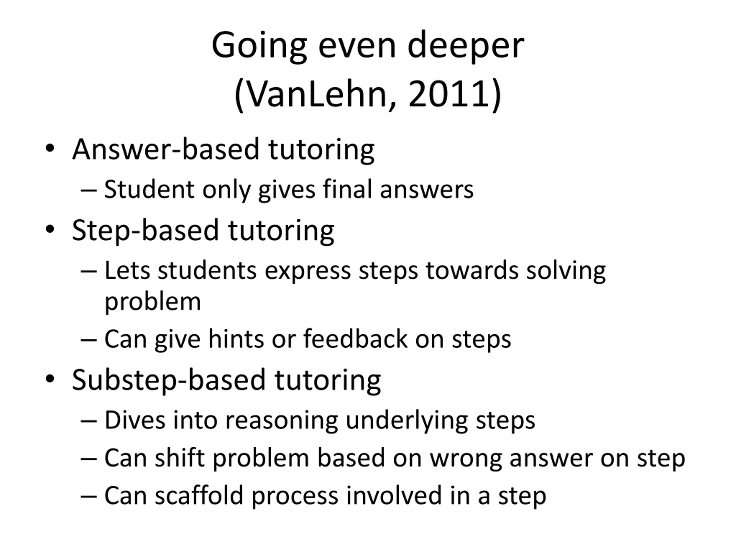 Going even deeper (VanLehn, 2011) Answer-based tutoring Student only gives final answers Step-based tutoring Lets students express steps towards solving problem Can give hints or feedback on steps Substep-based tutoring Dives into reasoning underlying steps Can shift problem based on wrong answer on step Can scaffold process involved in a step