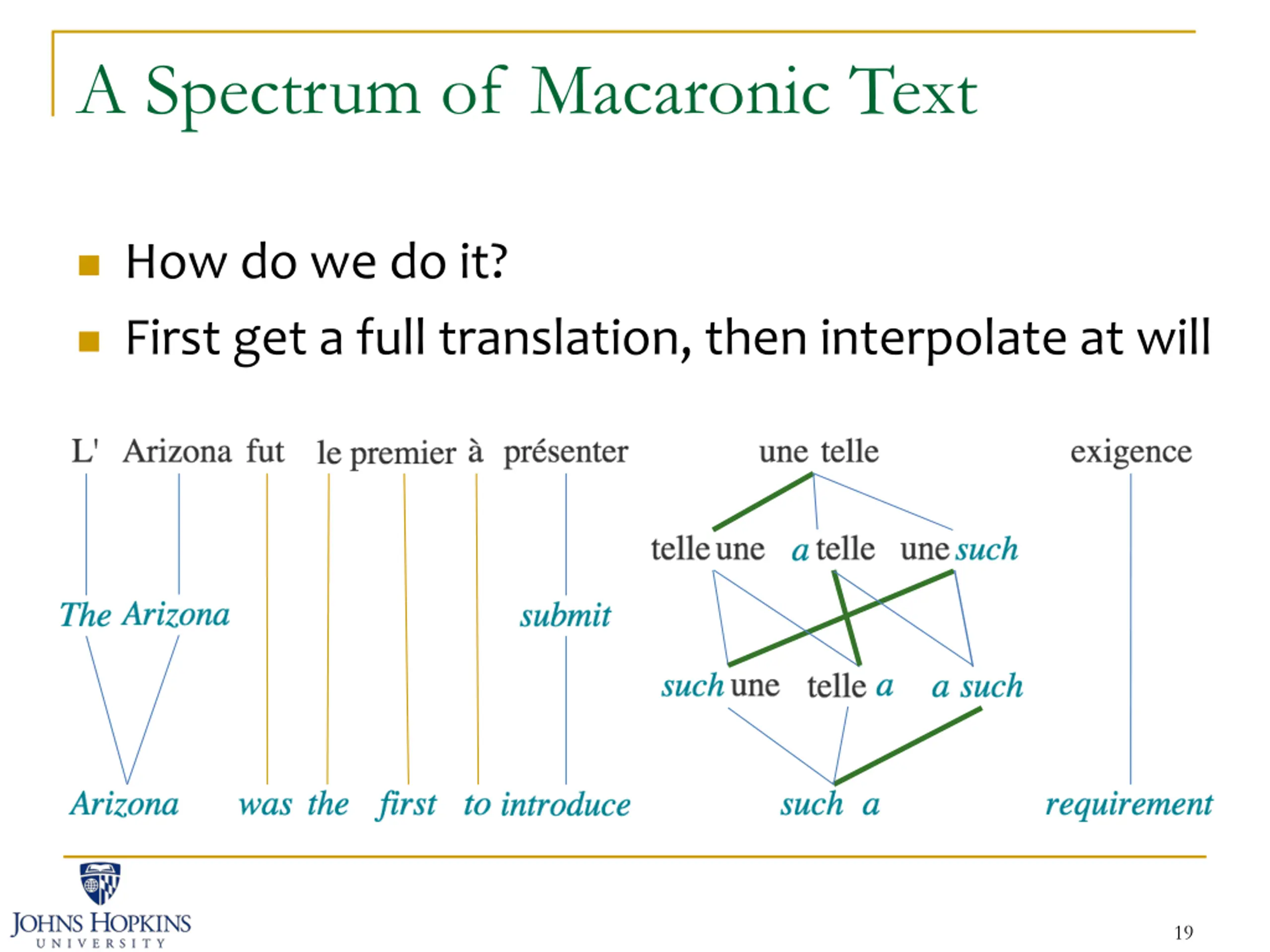 A Spectrum of Macaronic Text How do we do it? First get a full translation, then interpolate at will 18