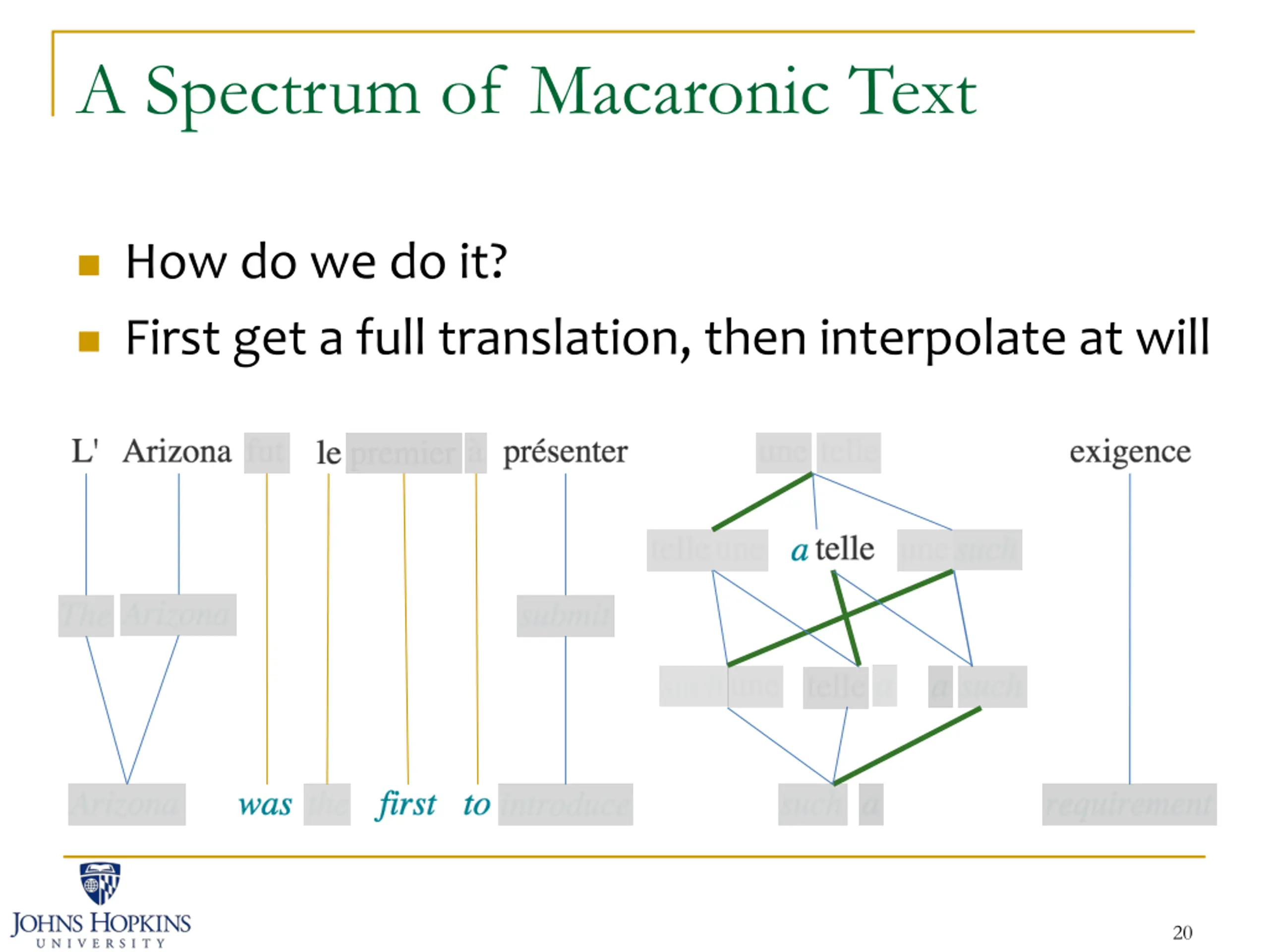 A Spectrum of Macaronic Text How do we do it? First get a full translation, then interpolate at will 19