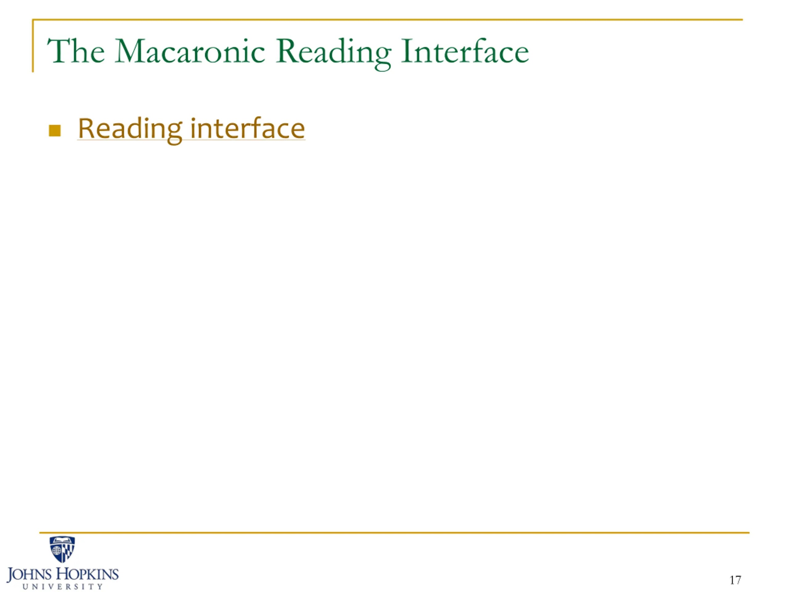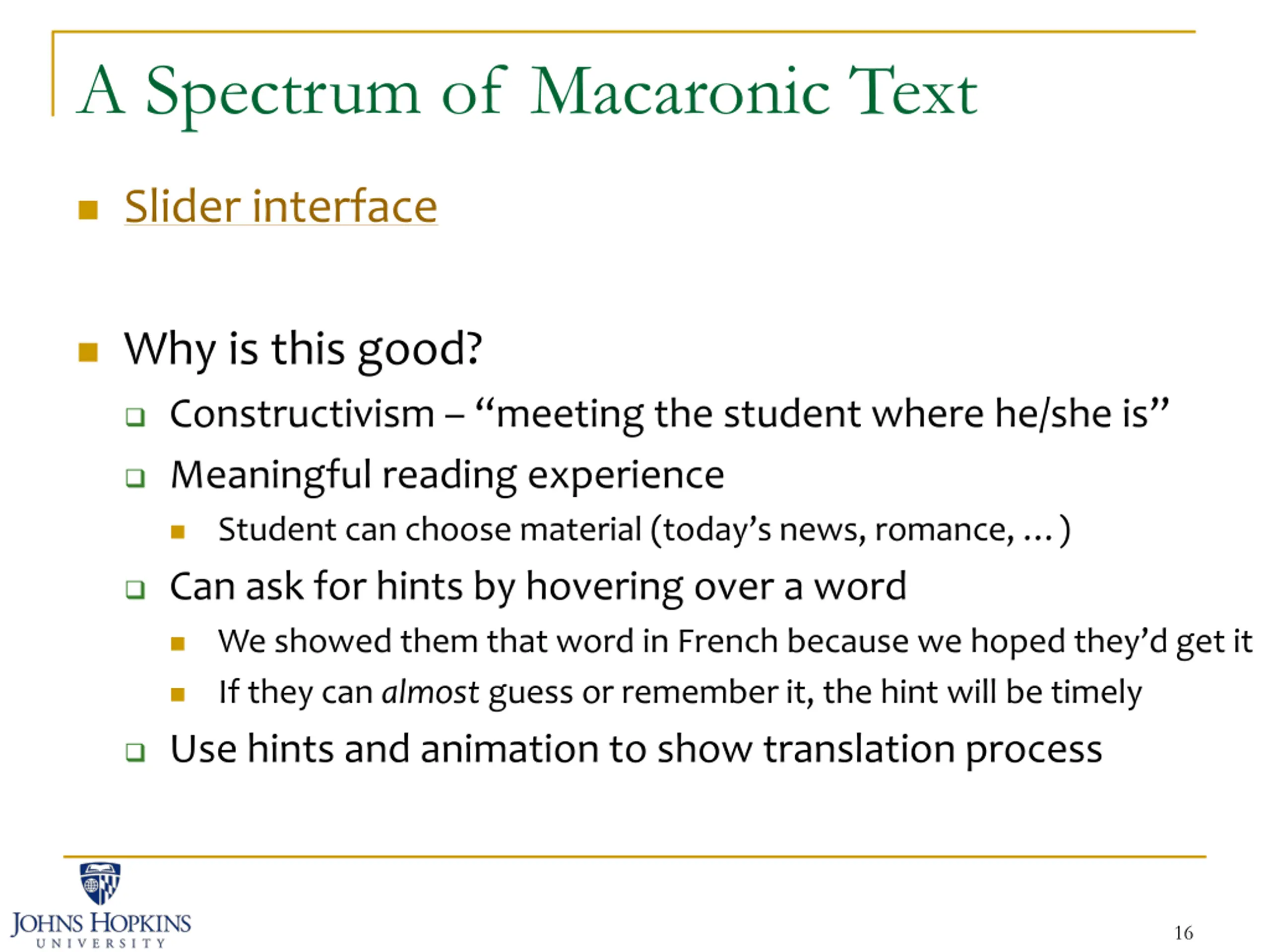 A Spectrum of Macaronic Text Slider interface Why is this good? Constructivism meeting the student where he/she is Meaningful reading experience Student can choose material (today s news, romance, ) Can ask for hints by hovering over a word We showed them that word in French because we hoped they d get it If they can almost guess or remember it, the hint will be timely Use hints and animation to show translation process 16