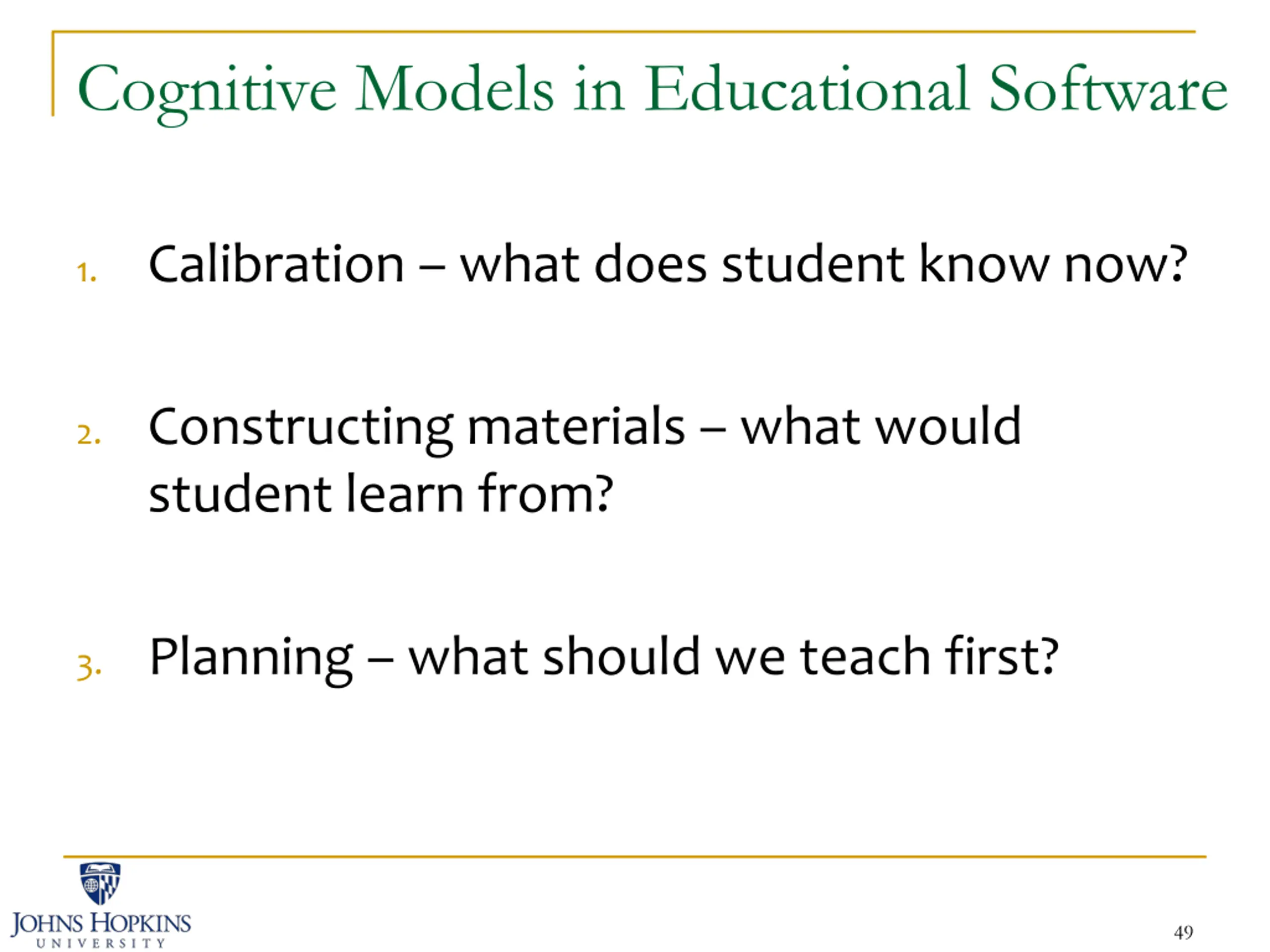 Cognitive Models in Educational Software 1. Calibration what does student know now? 2. Constructing materials what would student learn from? 3. Planning what should we teach first? 49