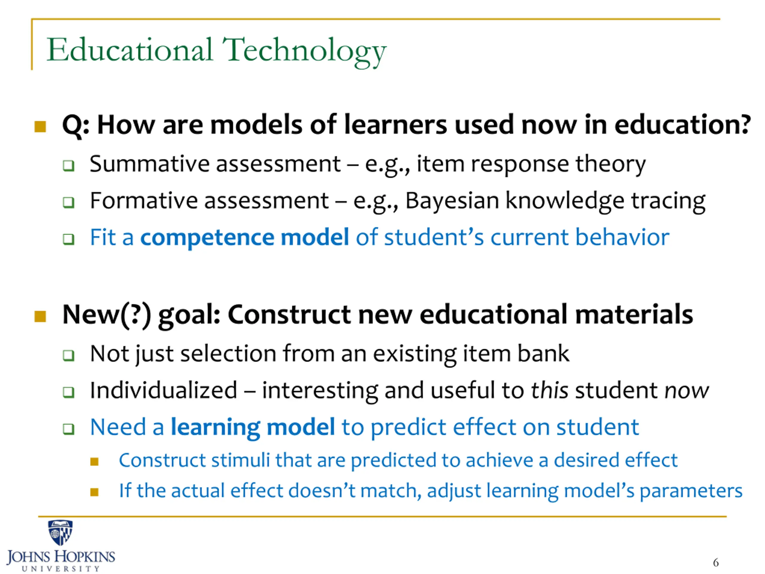Educational Technology Q: How are models of learners used now in education? Summative assessment e.g., item response theory Formative assessment e.g., Bayesian knowledge tracing Feedback during interactive homework Intelligent tutoring systems Educational games Fit a competence model of student s current behavior 5