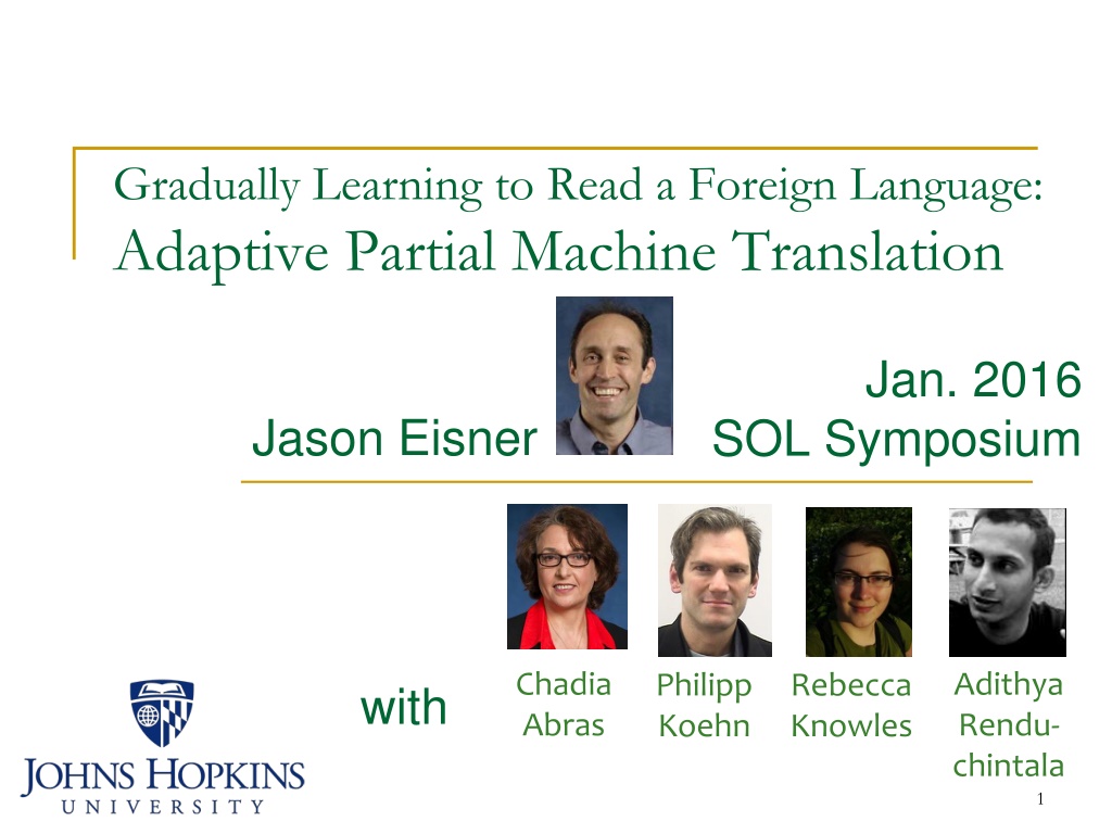 Gradually Learning to Read a Foreign Language: Adaptive Partial Machine Translation Jan. 2016 Jason Eisner SOL Symposium Chadia Abras Adithya Rendu- chintala Philipp Koehn Rebecca Knowles with 1