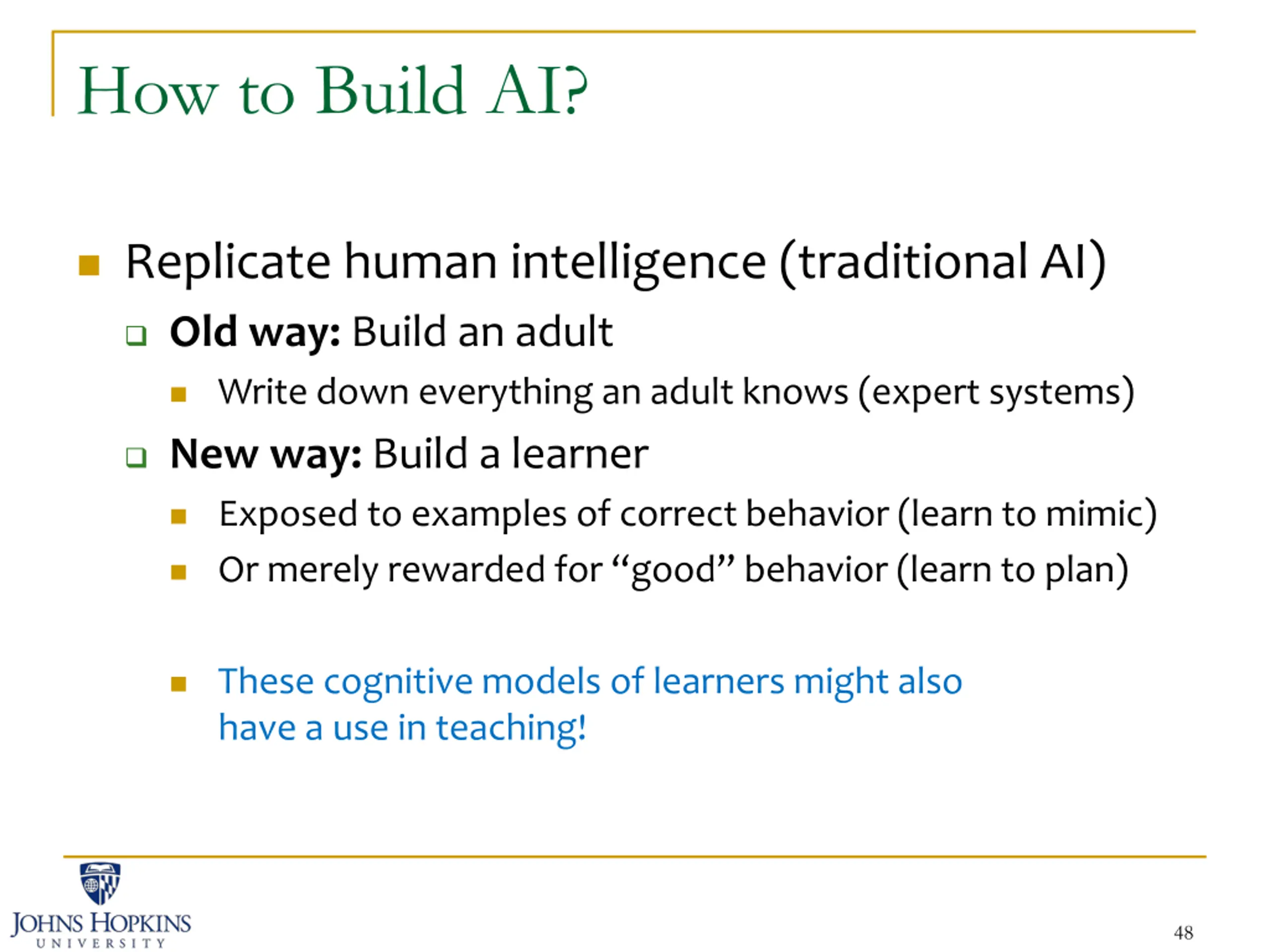 How to Build AI? Replicate human intelligence (traditional AI) Old way: Build an adult Write down everything an adult knows (expert systems) New way: Build a learner Exposed to examples of correct behavior (learn to mimic) Or merely rewarded for good behavior (learn to plan) These cognitive models of learners might also have a use in teaching! 48