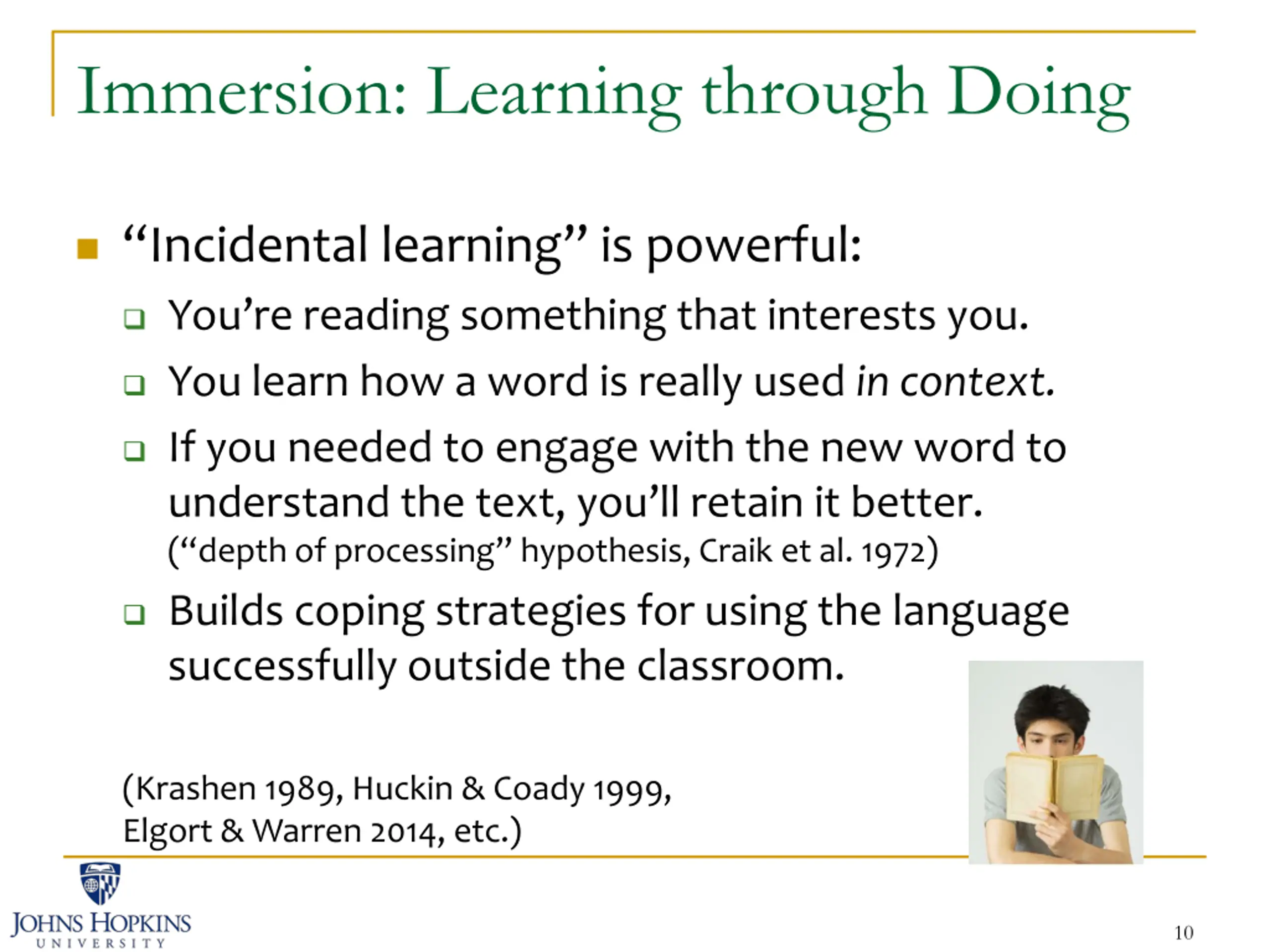 Immersion: Learning through Doing Incidental learning is powerful: You re reading something that interests you. You learn how a word is really used in context. If you needed to engage with the new word to understand the text, you ll retain it better. ( depth of processing hypothesis, Craik et al. 1972) Builds coping strategies for using the language successfully outside the classroom. (Krashen 1989, Huckin & Coady 1999, Elgort & Warren 2014, etc.) 10
