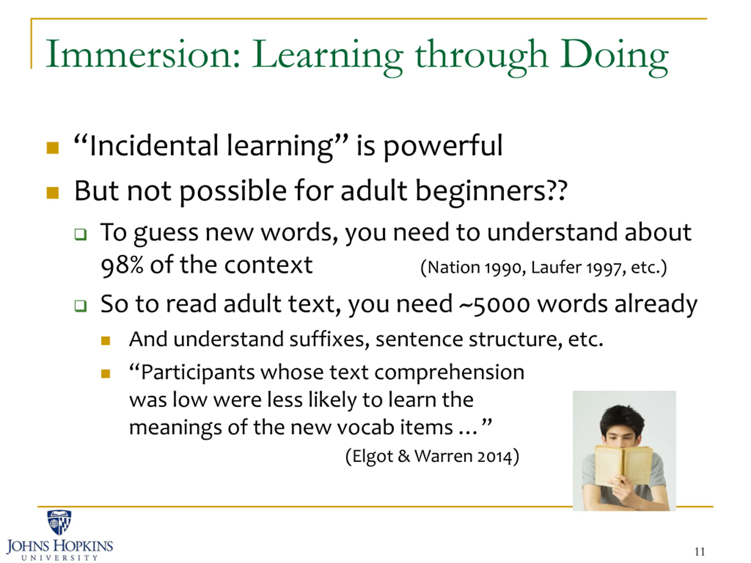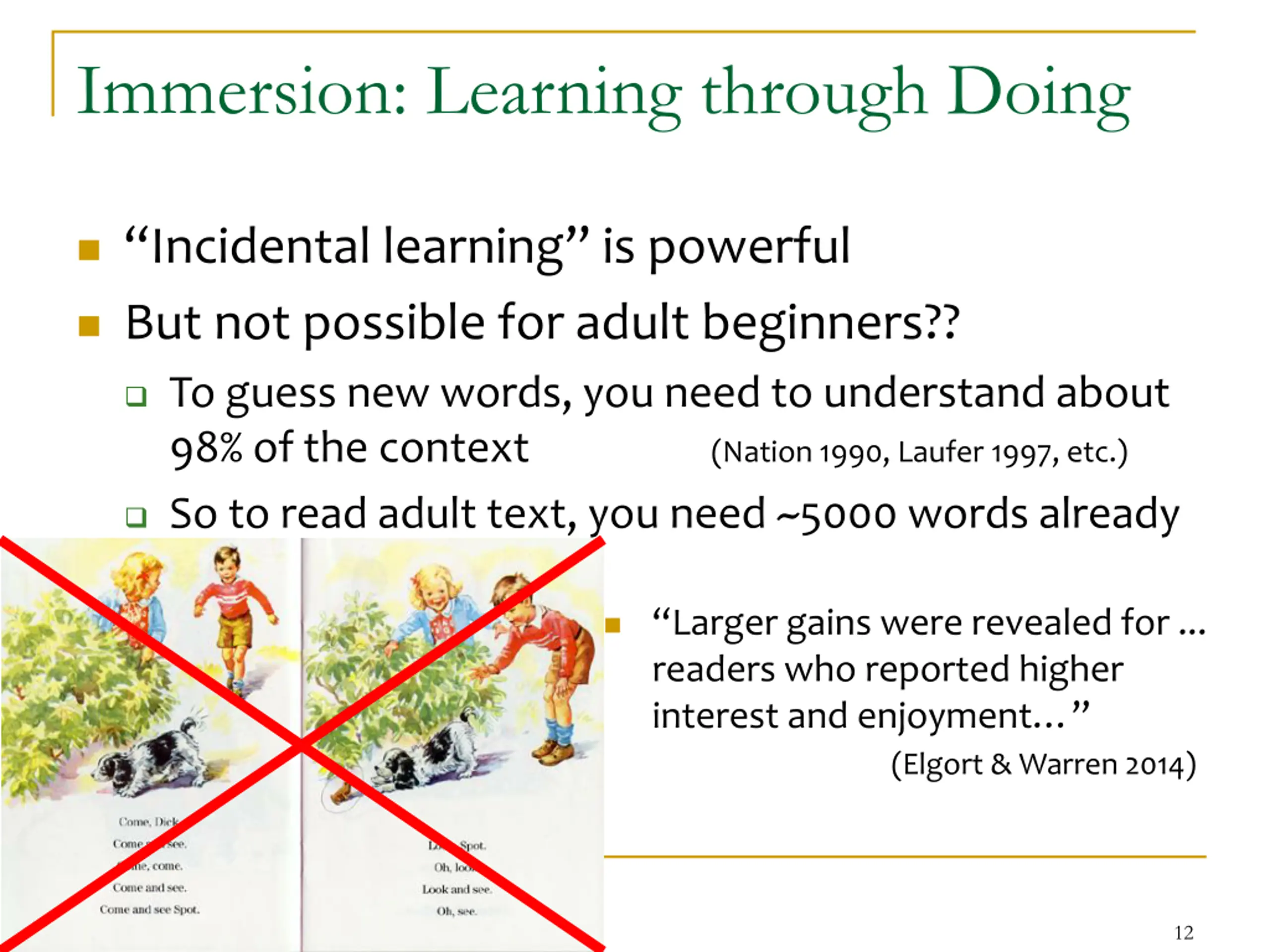 Immersion: Learning through Doing Incidental learning is powerful But not possible for adult beginners?? To guess new words, you need to understand about 98% of the context (Nation 1990, Laufer 1997, etc.) So to read adult text, you need ~5000 words already And understand suffixes, sentence structure, etc. Participants whose text comprehension was low were less likely to learn the meanings of the new vocab items (Elgot & Warren 2014) 11